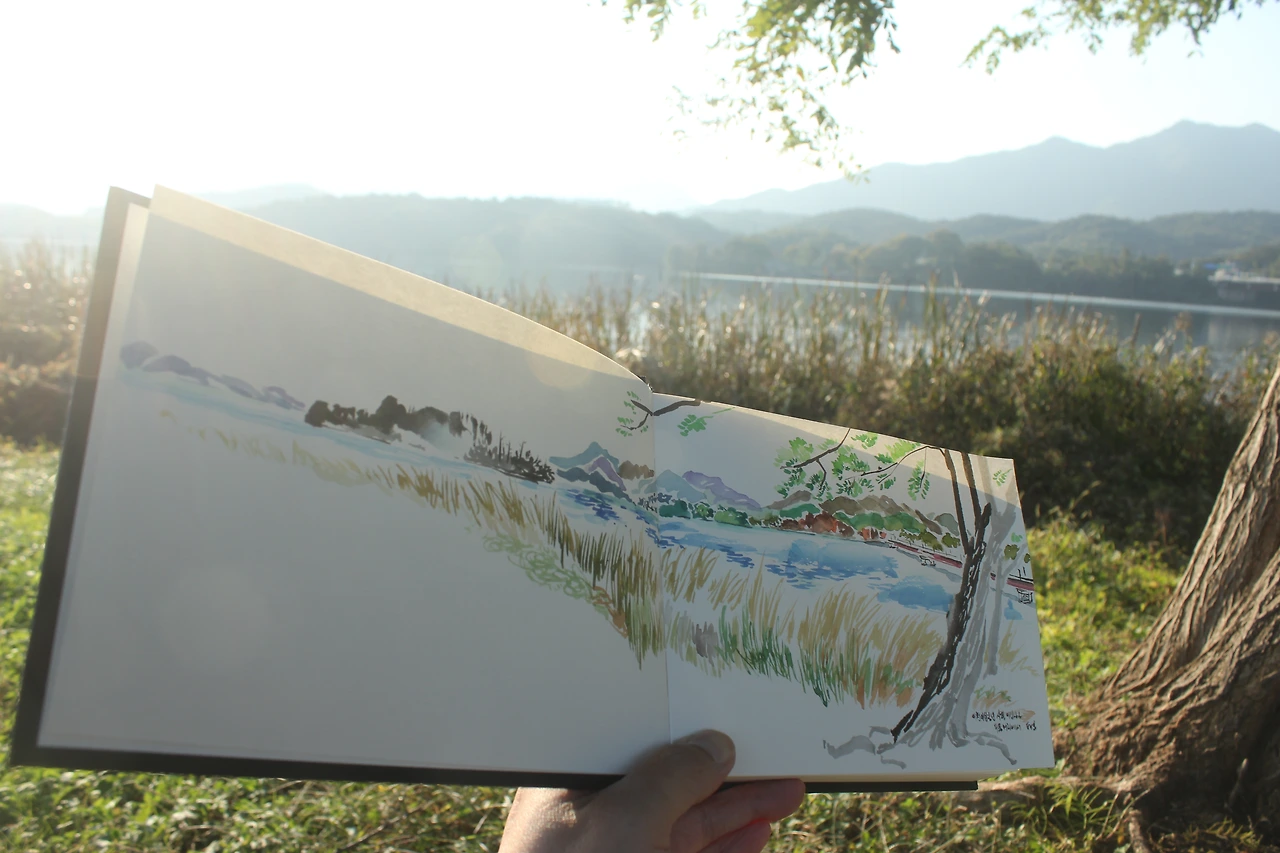 빛과 어우러져 아름답게 보이는 '족자 섬'을 보며 스케치북을 꺼낸다.