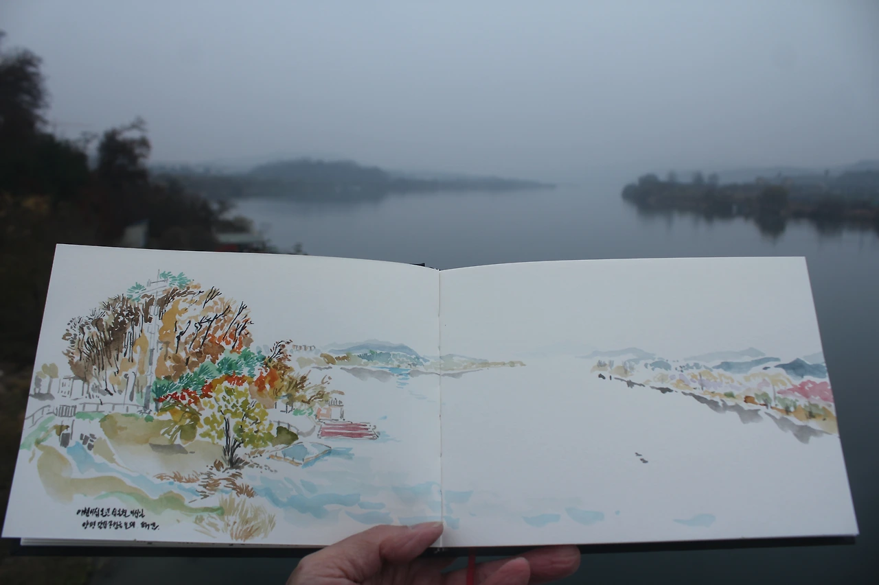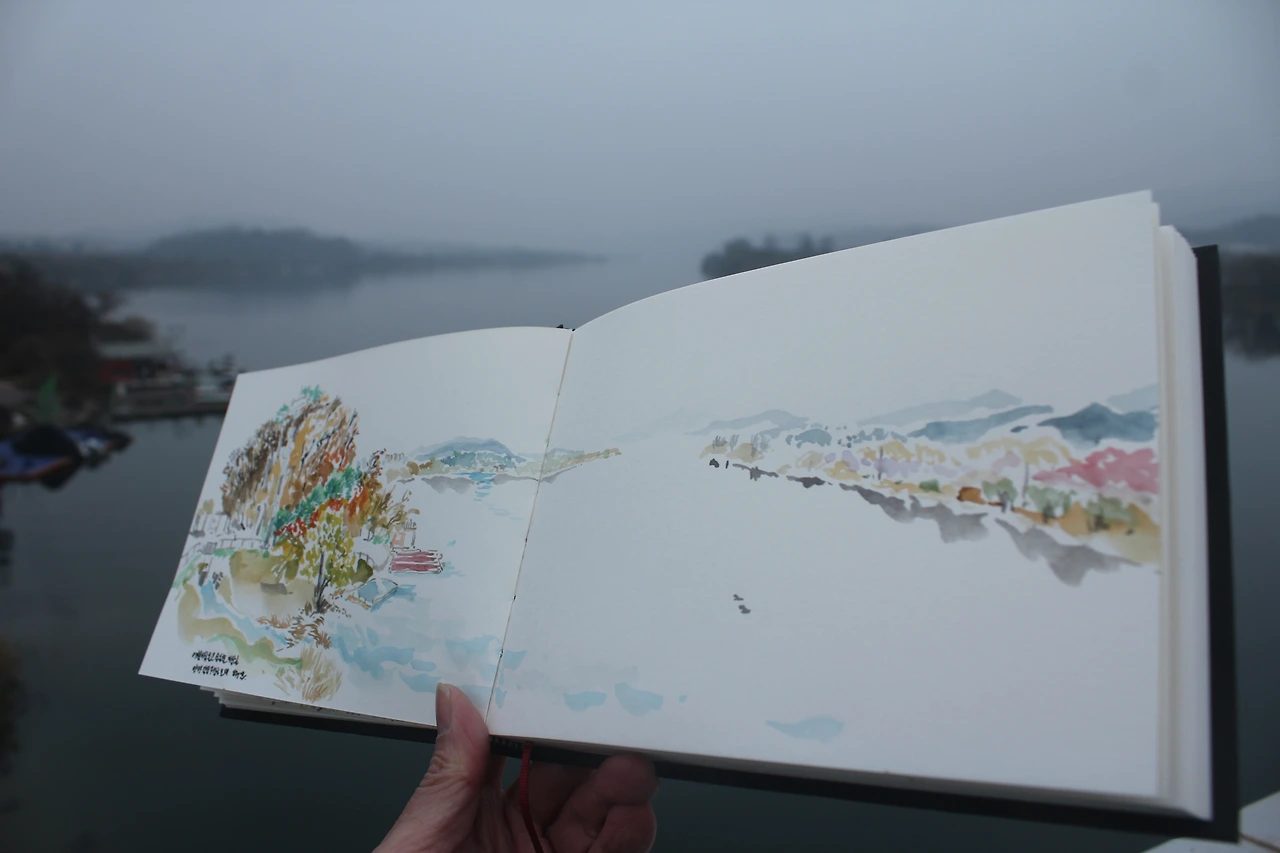 스케치북을 꺼내 안갯속의 아름다운 풍광을 안개가 공기에 녹듯 천천히 스케치한다.