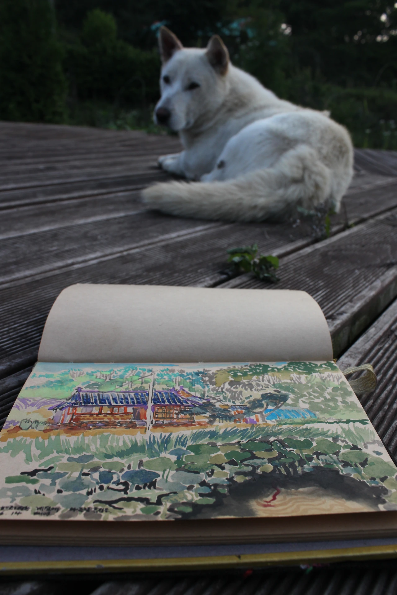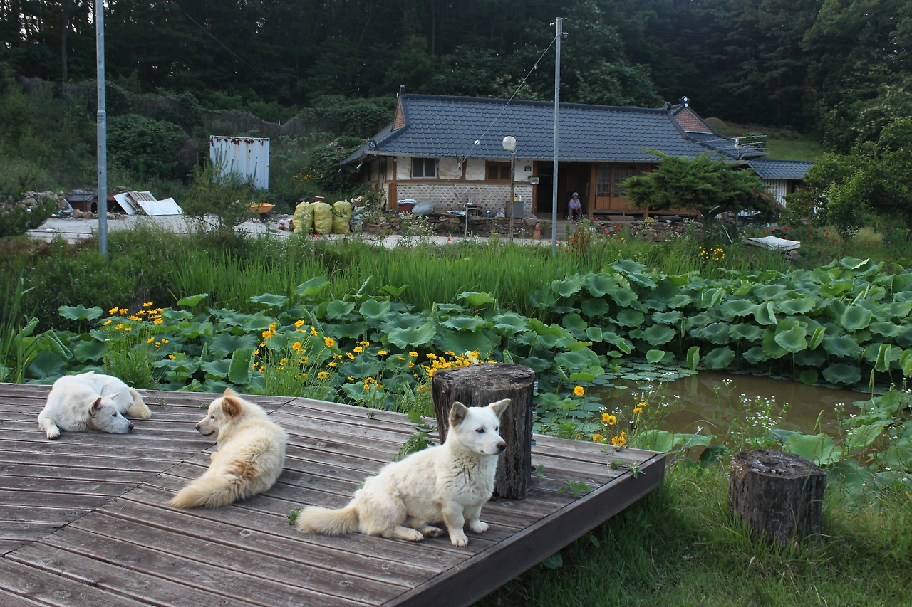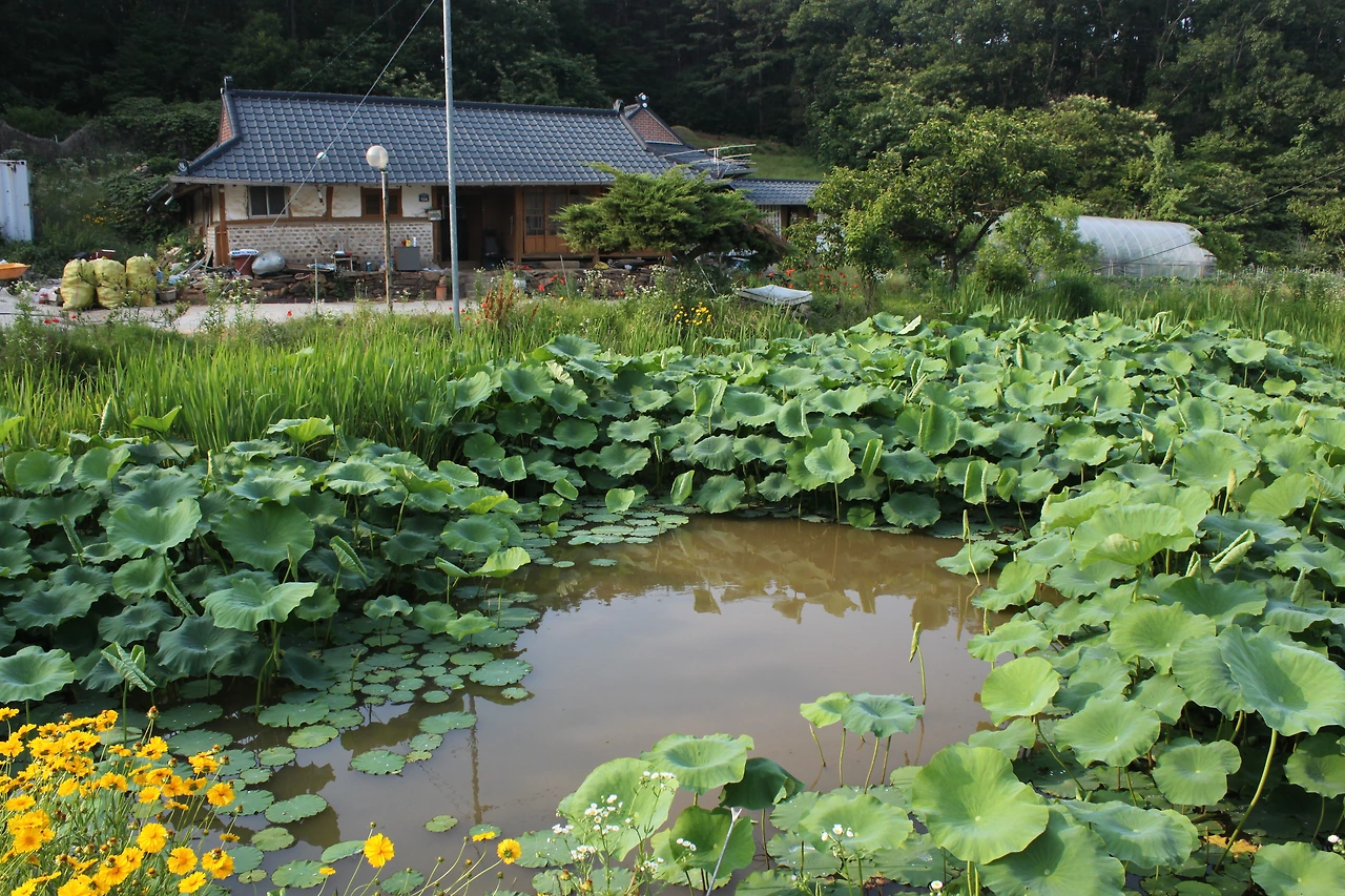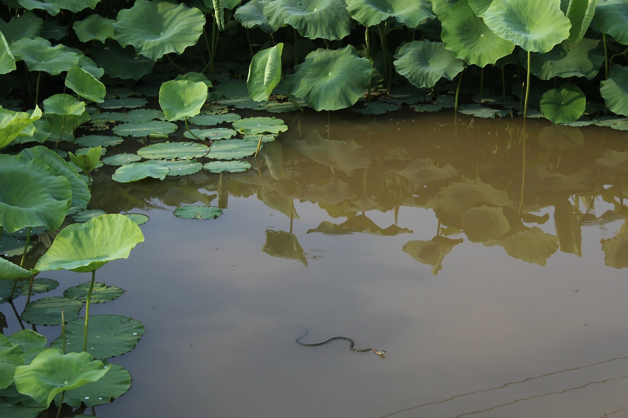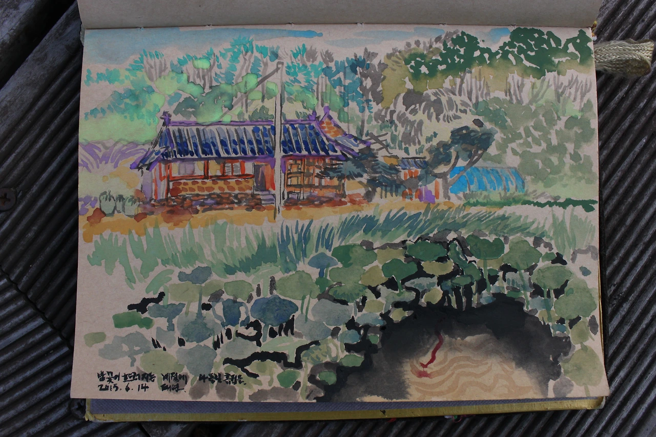 터미널 안내 부스에서 오는 길에 버스가 많지 않으니 반대로 돌으라 이야기해 줘서 반대로 가는 버스를 타고 '탑재 삼거리'에서 내려서 '가릉'으로 가는 길을 나섰다. 능묘 가는 길에는 그래도 사람들이 보여서 덜 외롭게 움직일 수 있었다. '가릉'에서 '석릉' 가는 길에는 소나무 잎으로 깔려진 숲길이라 솔향기가 코끝을 닦아주고 솔잎 사이로 벌레들의 움직임이 바쁜 듯 보였다. 가릉을 지나 석릉으로 가는 길에 작은 실개울도 보이고 (아마 비가 와서 임시로 생긴 듯한) 노루도 보였다.. 길을 헤매다가 둘레길 이정표와 리본이 사라졌다. 지도를 보며 지명을 찾아서 가기로 했다. 해뜰원을 지나 나들길 흙집을 지나는데 흙집 근방에 연못이 조성되어 있다. 연잎이 가득한 풍경이 너무 사랑스러워 조심히 연못 가운데로 들어가보는데 입구를 지키던 강아지 세 마리가 길을 안내하듯이 앞장서서 간다. 풍경이 아름다워 늦었지만 스케치북을 아니 꺼낼 수 없어 스케치북을 꺼내 풍경을 옮겨낸다. 그때 물속에서 무언가가 주시하고 있는 게 보인다. 물뱀이다. 크기는 그렇게 크지 않은데 화려한 색과 물 위에서 꼿꼿이 서있는 모습이 흡사 화려한 장어 같다.