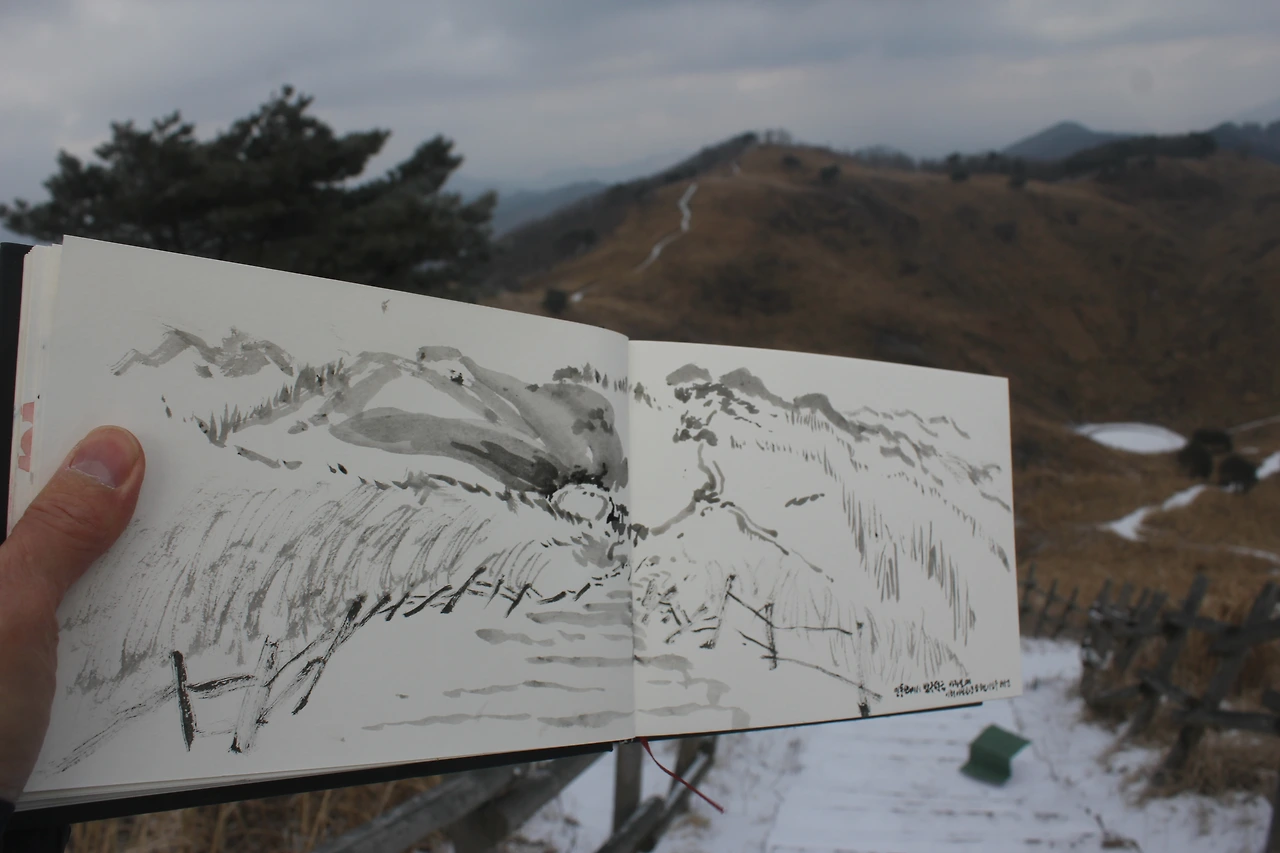정상에 올라 마을과 구비구비 산을 조망하다 뒤쪽을 바라보니 하얀 동그란 연못 같은 '돌리네'가 인상적이다. 그곳에서 차가운 바람을 피해 10여분 크로키하듯 스케치한다.
