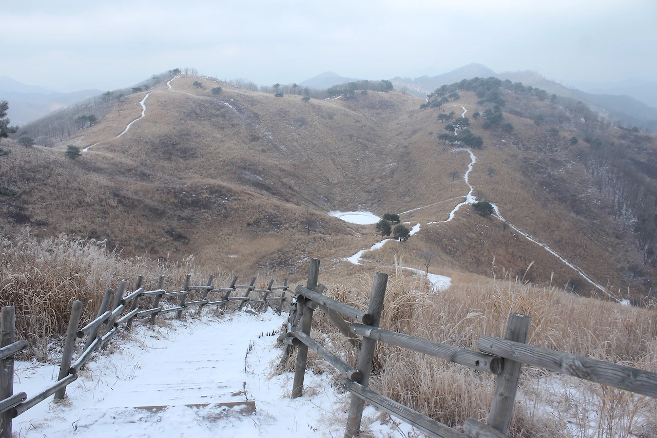 억새와 변화무쌍한 하늘과 구름과 그사이 쏟아지는 햇빛을 즐기며 오르니 눈과 어우러진 억새밭이 더 금빛으로 보인다.