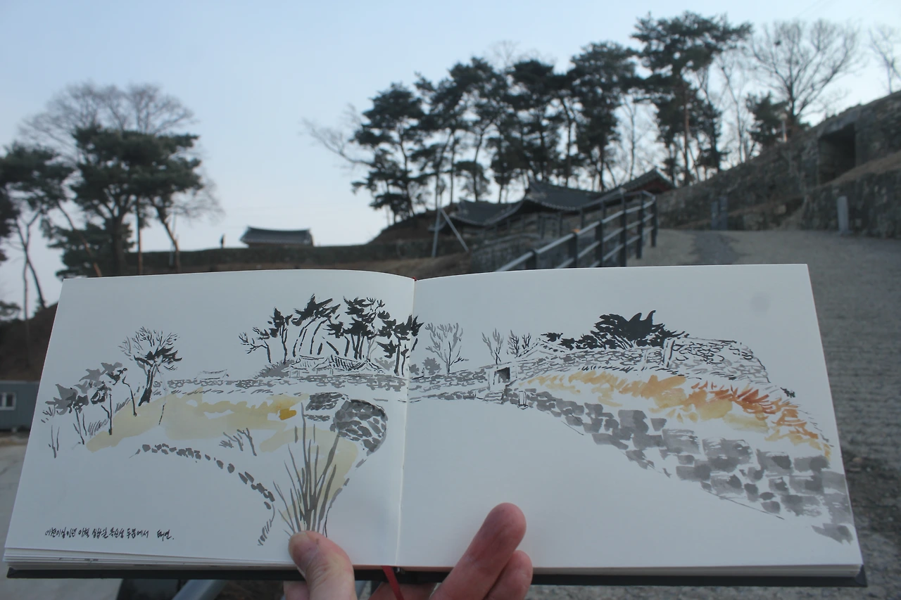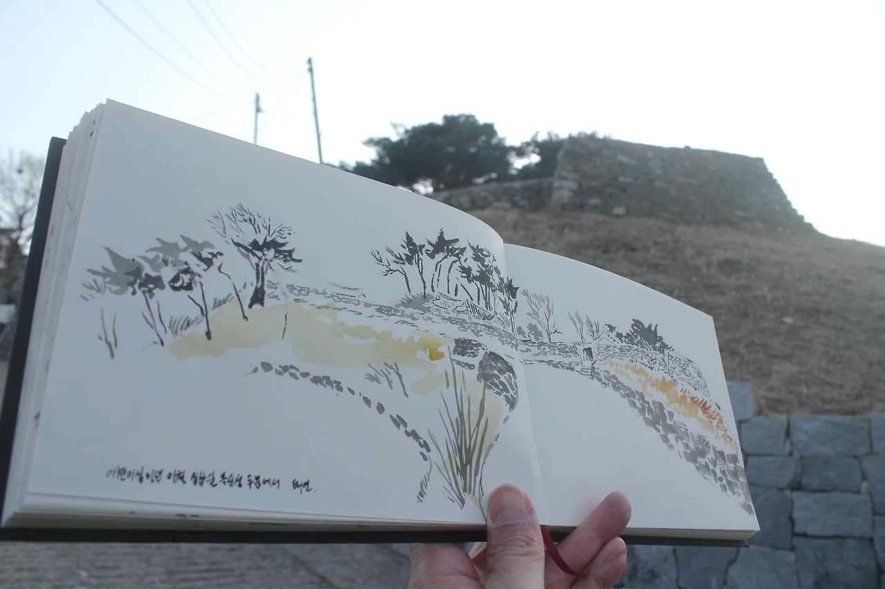 '보적사'로 오르기 전 화장실과 주차장이 있는 산성 바로 밑에서 스탬프를 찍고 올라가는 굽고 경사진 길에서 보는 산성이 아름다워 내려다보다 스케치를 한다.