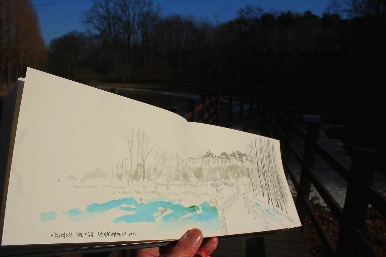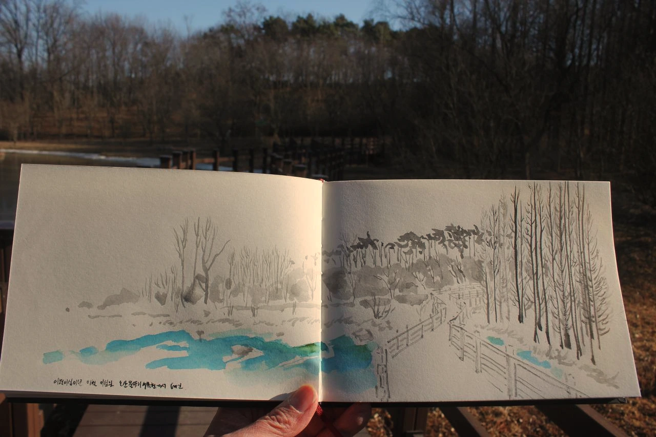 메타세쿼이아 나무가 있는 연못에서 풍광이 여유로워 스케치북을 꺼내 살짝 느낌을 담아본다.