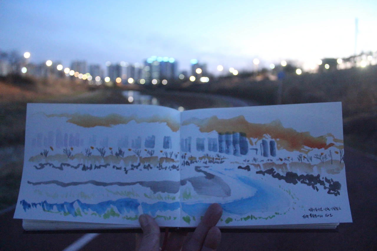 그 신도시를 따라 나가다 보니 나타나는 통복천 어둠이 내려오고 있어 짧은 크로키라도 남기려 붓을 꺼낸다. 통복천의 해지는 인상을 15분여 만에 남긴다.