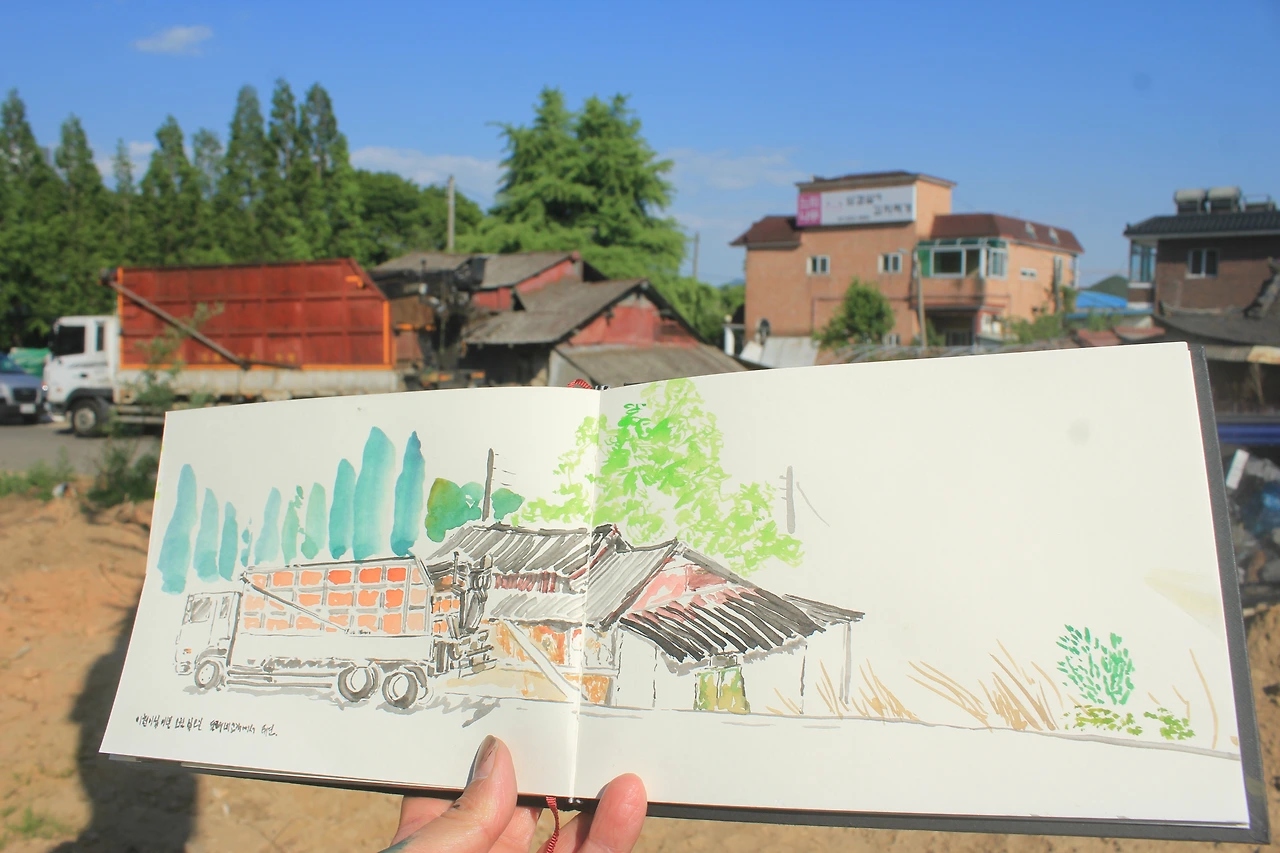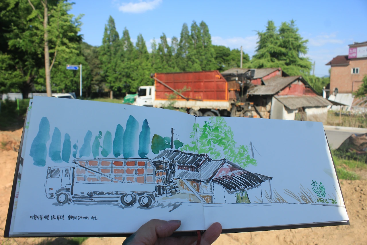40,50년 되어 보이는 흙담으로 만들어진 집이 재활용 수집차와 어우러져 과거와 현재가 공존한 느낌이 들어 소나무 그늘 밑에서 스케치한다.