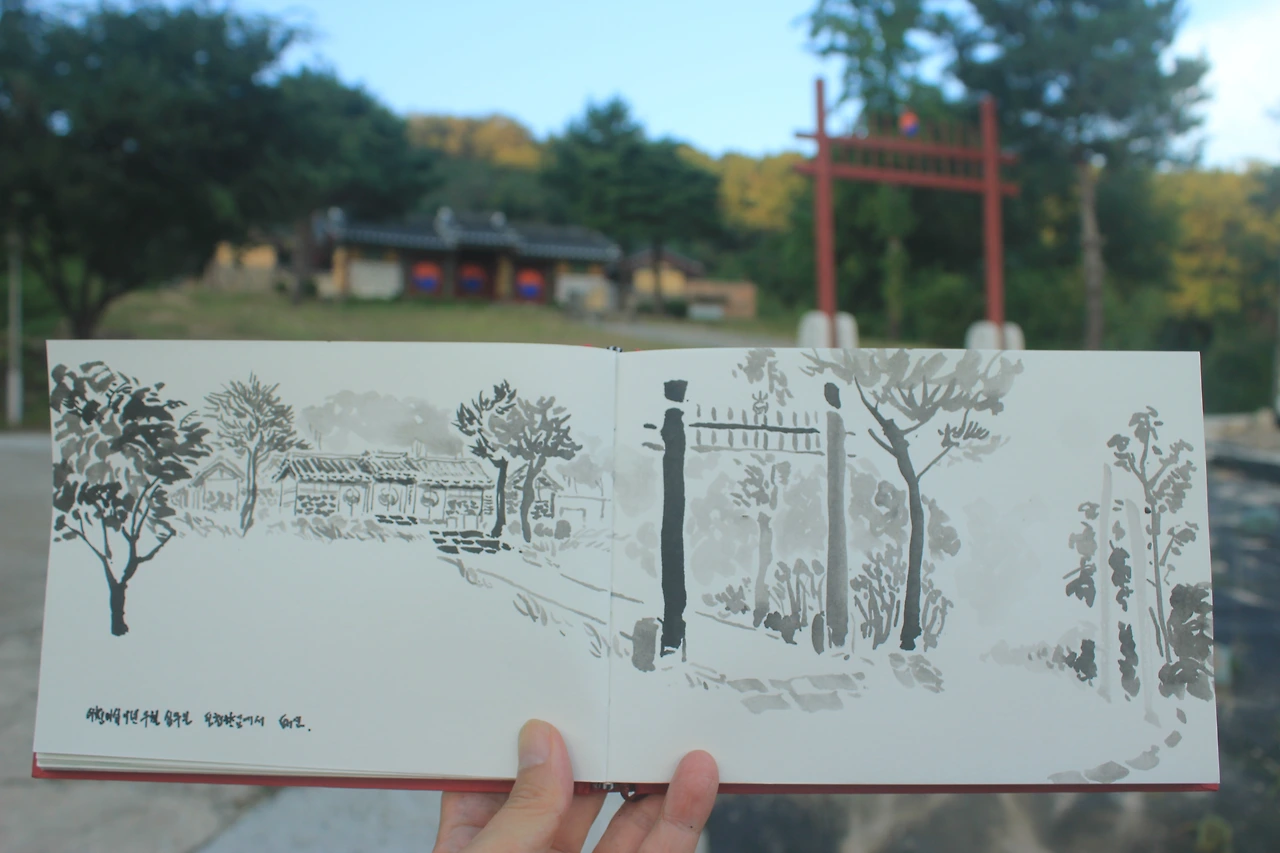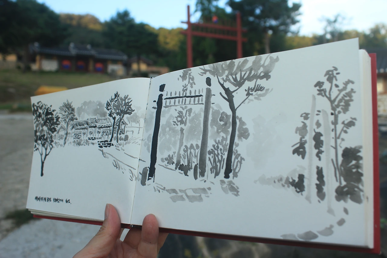 '경기도 문화재 자료 제16호 포천향교'에 도착해 스케치북을 펴고 먹으로 색을 표현한다