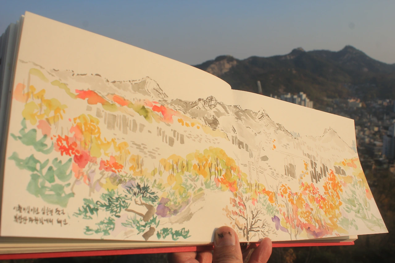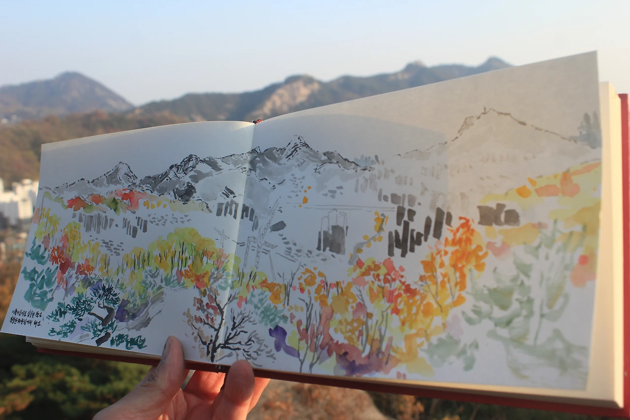 '북악산' '인왕산' '안산'이 파노라마로 보이는 전망대에서 가을 햇살을 맞으니 더 움직이고 싶은 생각이 없어져 자리를 펴고 스케치를 하기 시작한다.