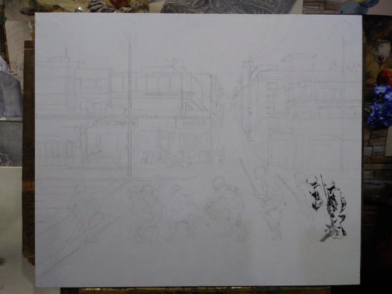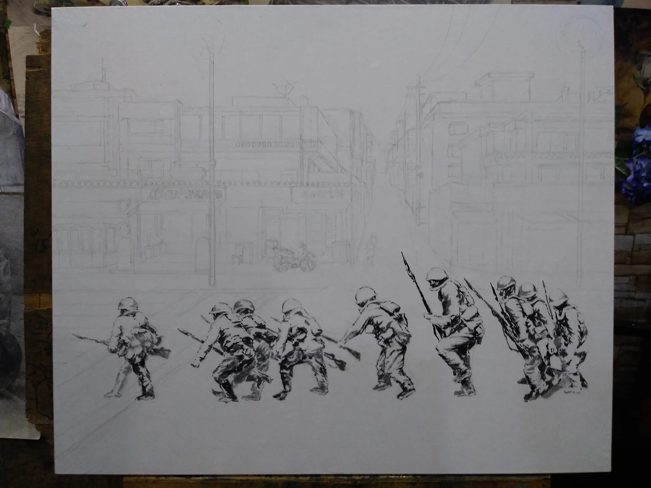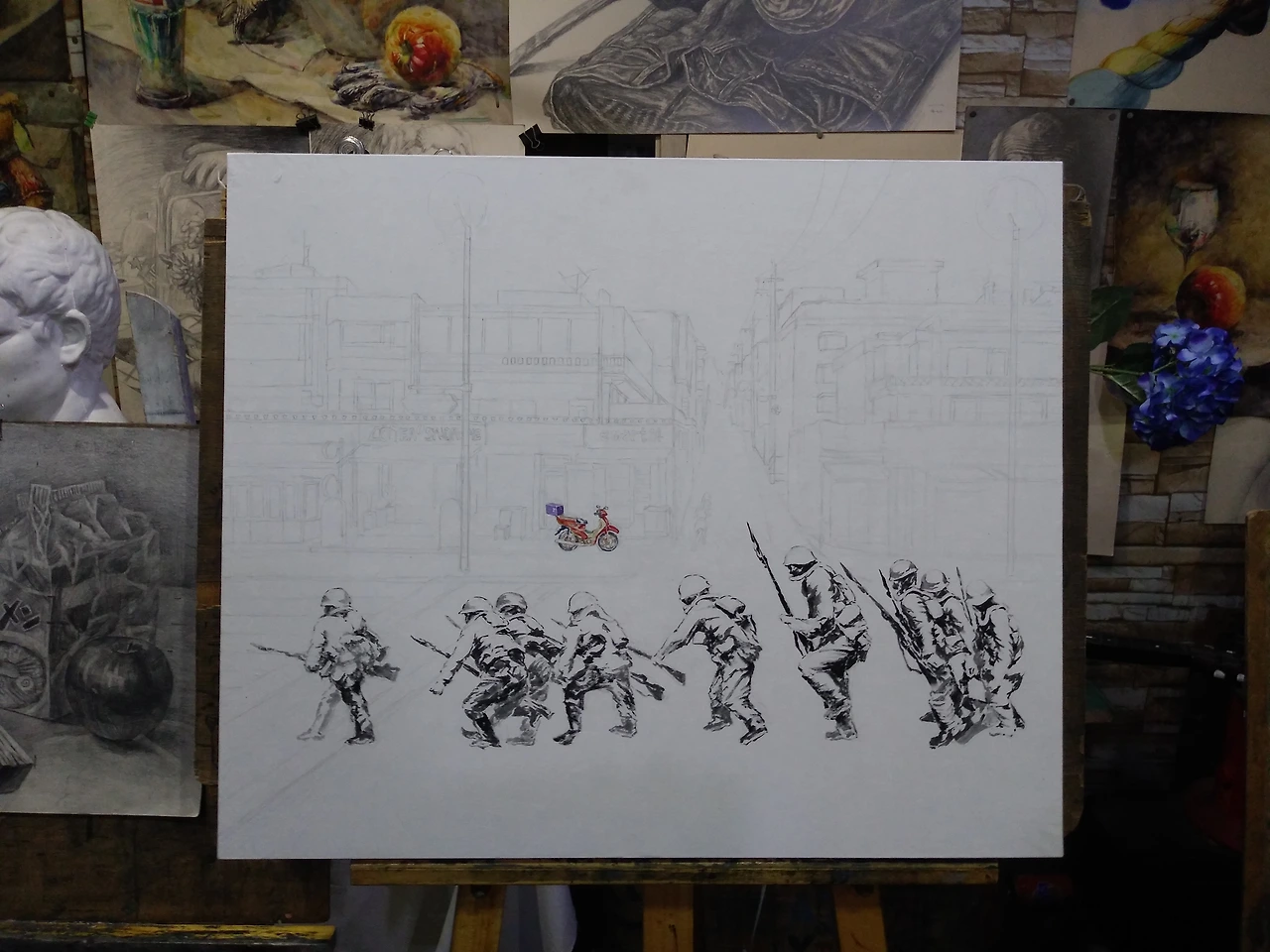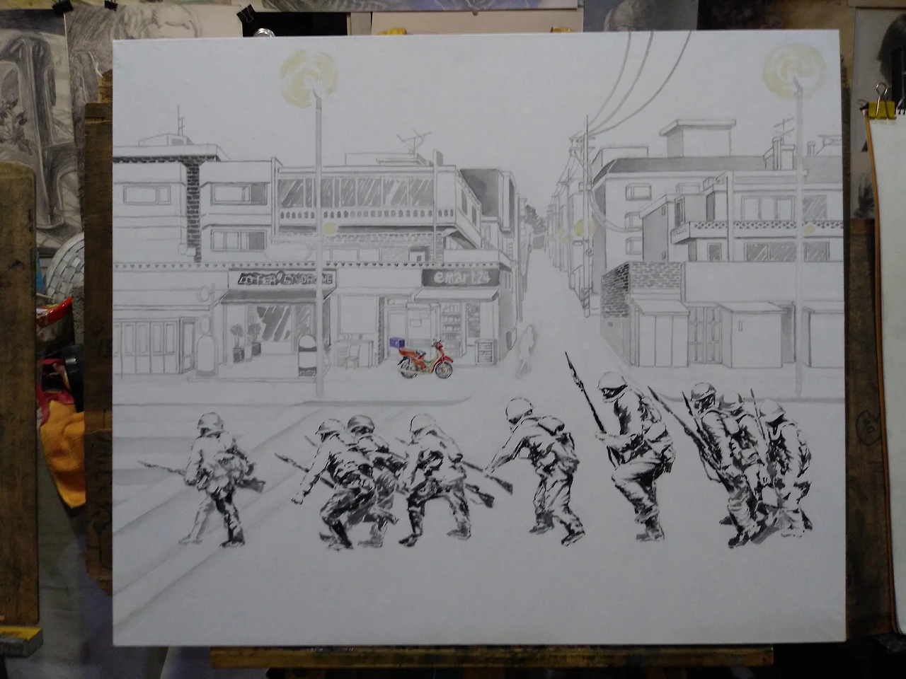 그 공간에 성산동의 일상적인 풍경과 일제강점기 일본군의 모습을 같이 배치해 스케치한다.