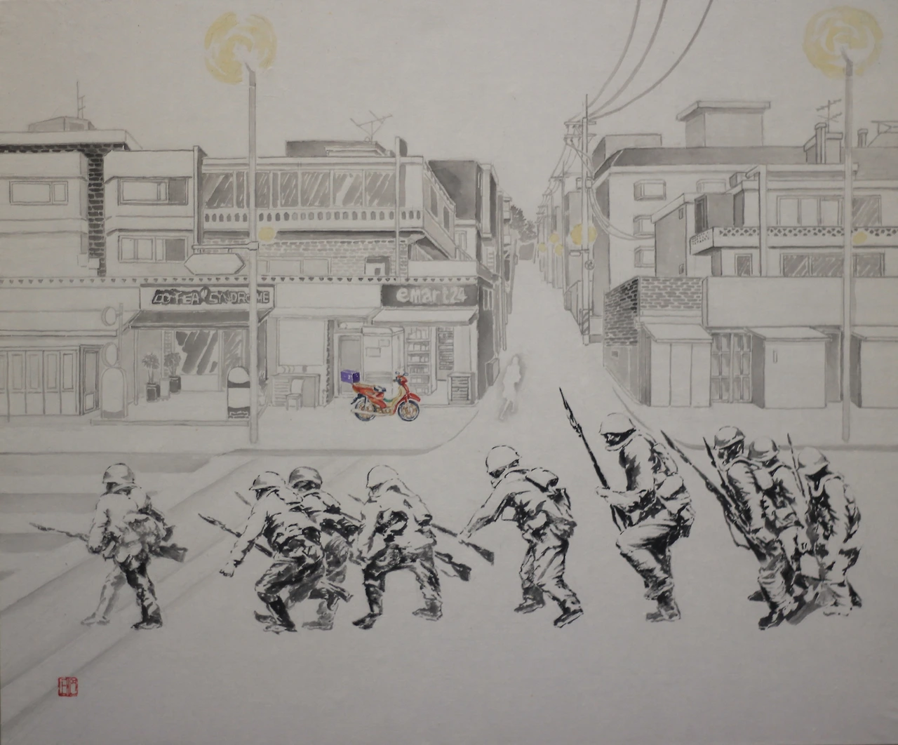 2, 일본군의 모습을 선명하고 거칠게 표현하기 위해 검정 동양화 물감으로 그 움직임과 동작을 고려해 크로키하듯 그려낸다.