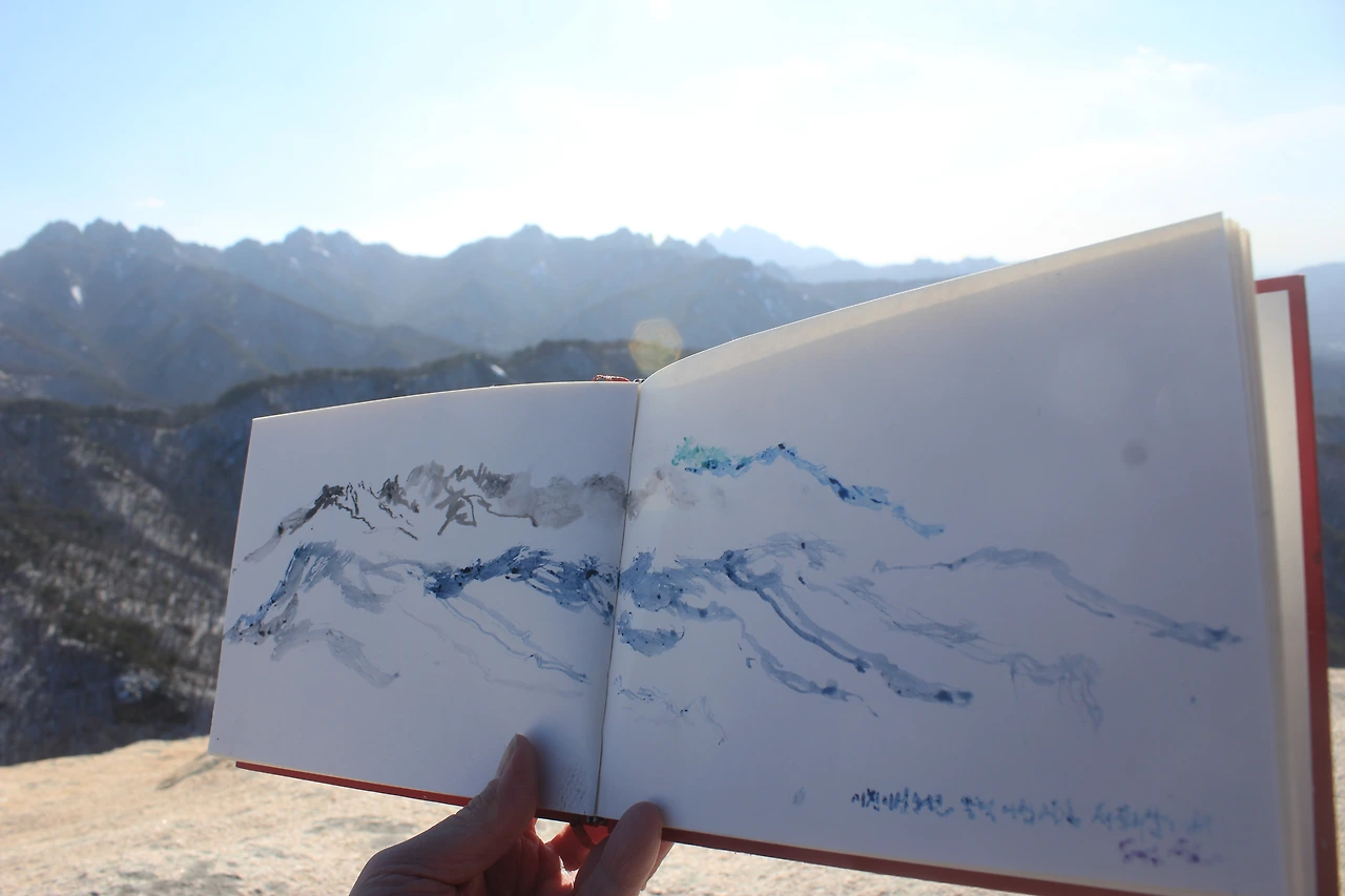 어떻게든 흔적을 남겨가고 싶어 물감을 따르자마자 산의 실루엣을 남긴다.