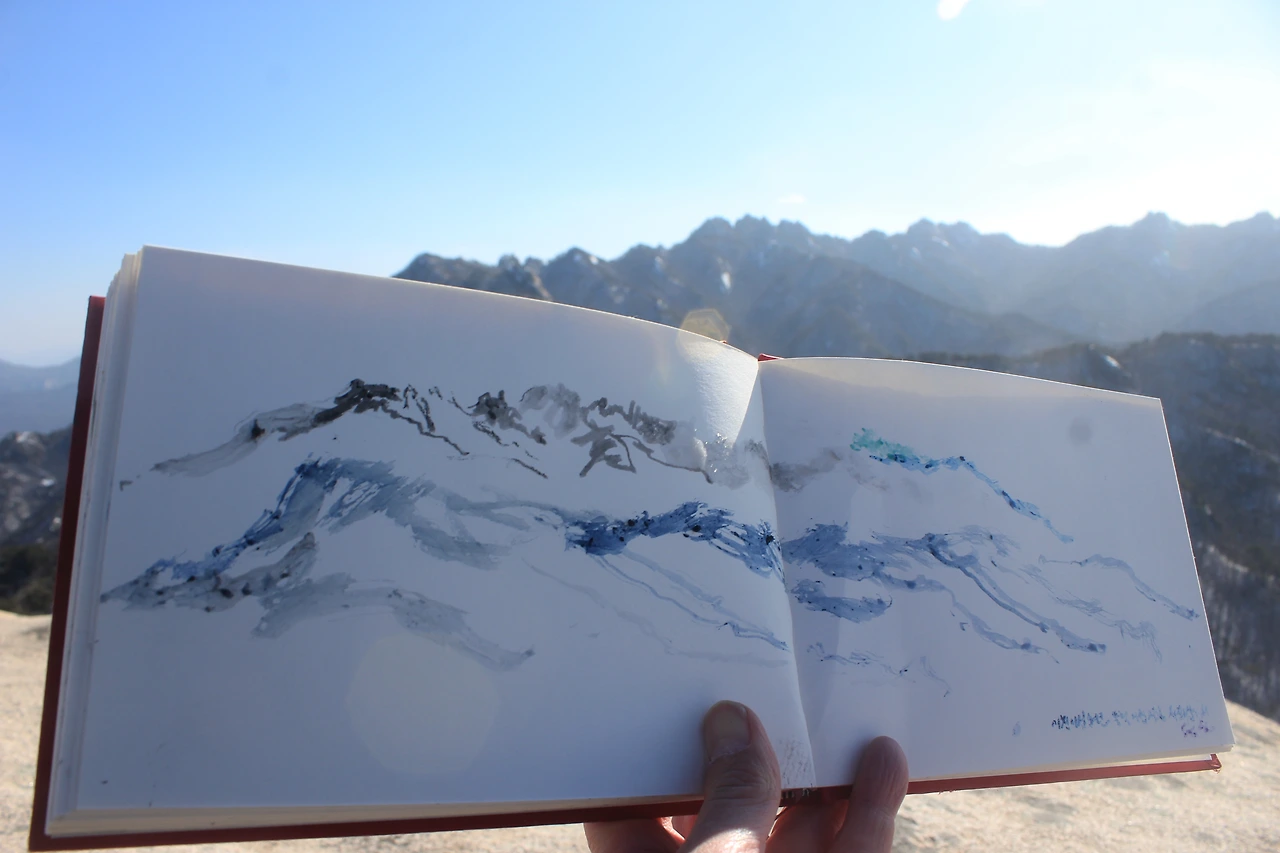 그 아름다움을 담기 위해 먹과 물을 따라보지만 칼바람 부는 산 꼭대기에서 극한의 추위는 그 모두를 얼려버린다.