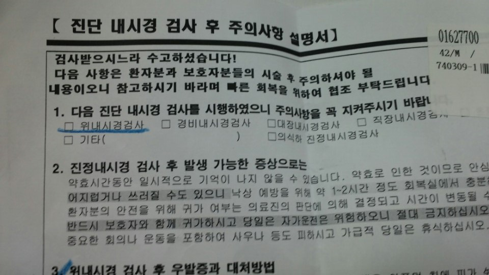 뭐 이렇게 바로 검진실로 가라니.. 검진실에서 몇 가지 약 먹는 것 물어보더니 재작년에 있다고 해서 걱정되던 용종에 대해 문의했더니 일정 크기가 안되어서 잘라내지 않았을 거라고 한다..