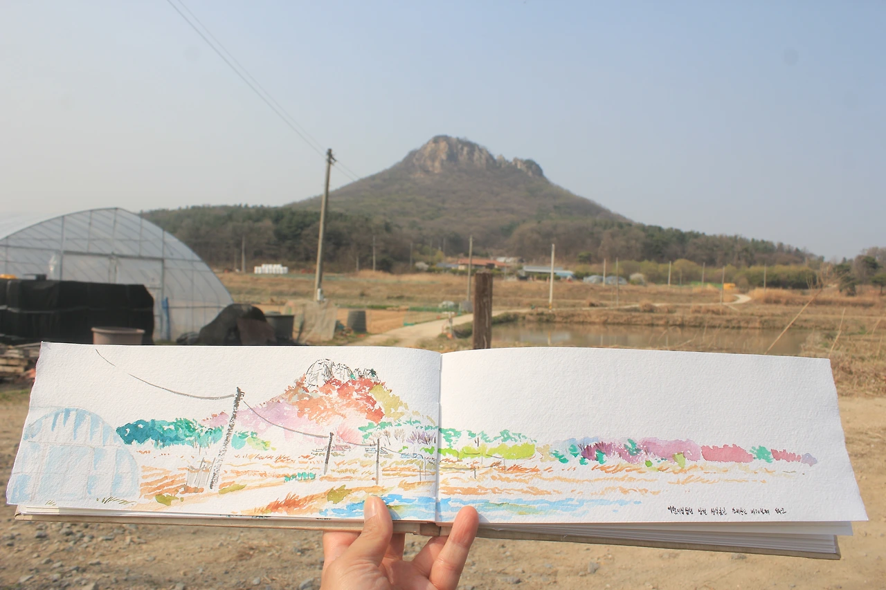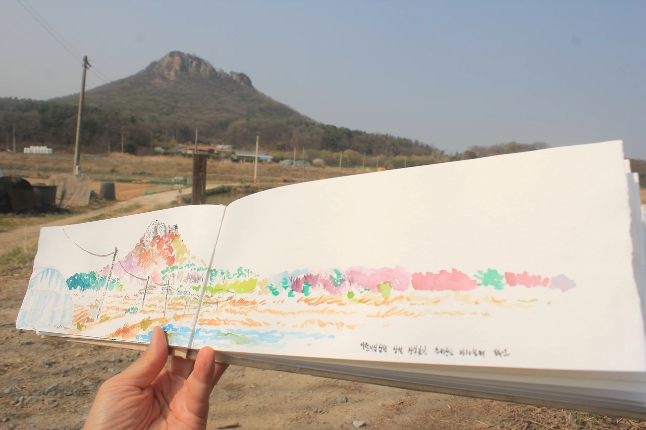 초반부터 그림을 그리면 나중이 힘들어질 것 같아 참고 참고 또 참았는데 안 그리고 가면 오늘 하루종일 후회할 거 같아 흐르는 천변 다리에 앉아 봄, 조비산의 풍광에 봄처럼 부드럽게 물감과 먹을 녹여본다.