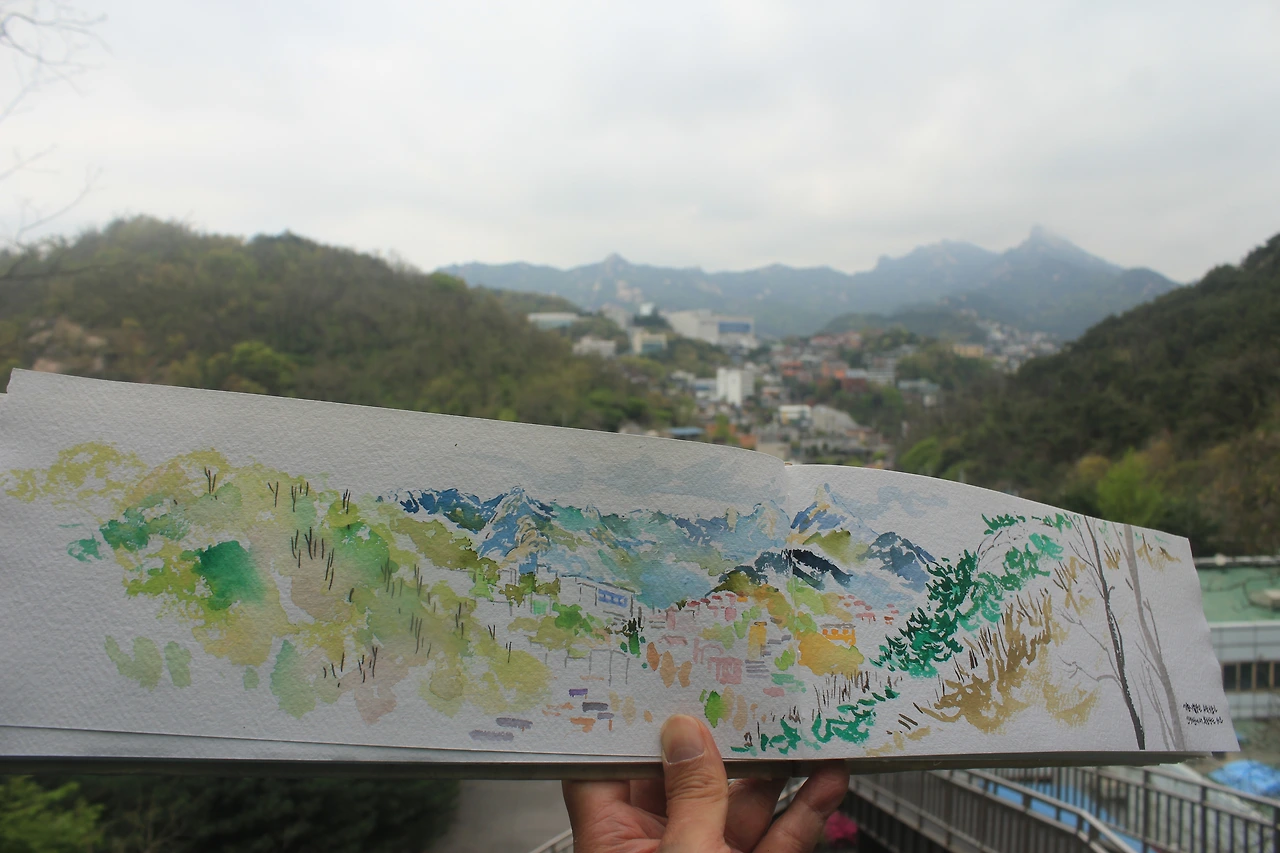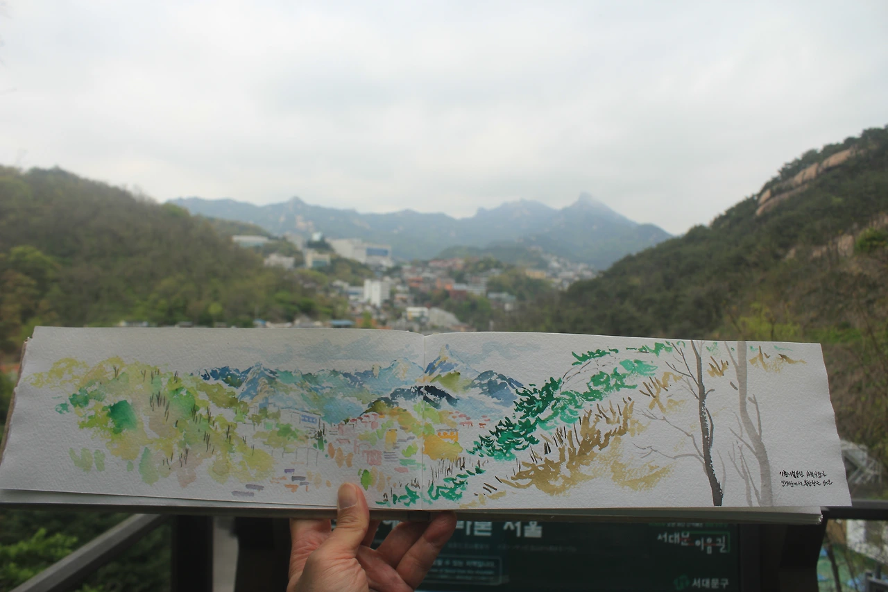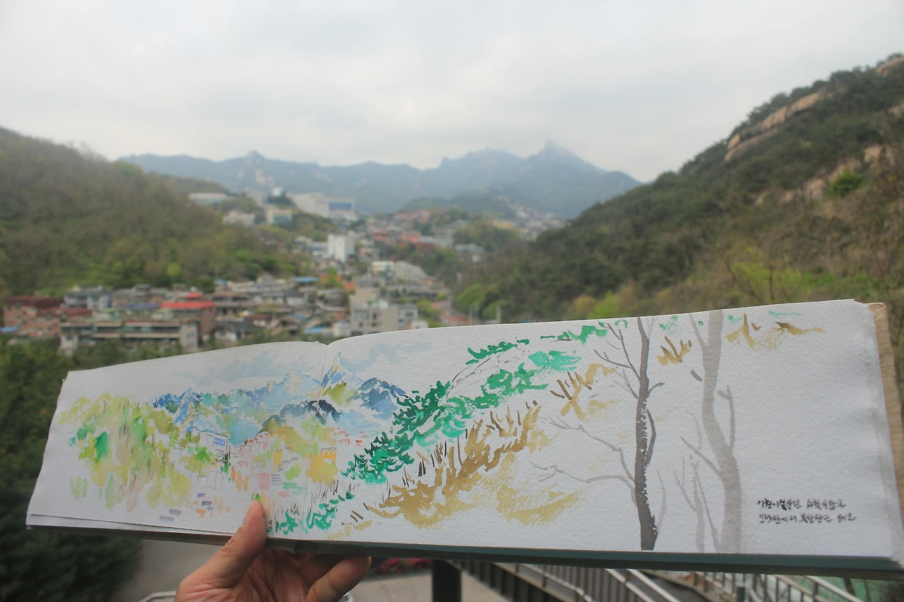부분 부분 걸었던 그 길을 완주하기 위해 '홍지문'에서 시작해 다시 돌아오기로 한다. 홍은 배수지에서 오르는데 오르자마자 오전에 내렸던 빗줄기로 환상적인 풍경을 보여주고 있어 입구에서 스케치북을 편다.