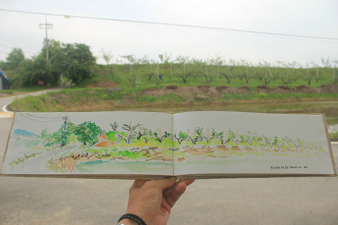 그곳에서 스탬프를 찍고 마을회관까지 내려가 '석성호' 저수지를 둘러보고 화장실에 들린 후 다시 스탬프가 있는 부내미 다목적회관에 올라와 스케치를 한다.