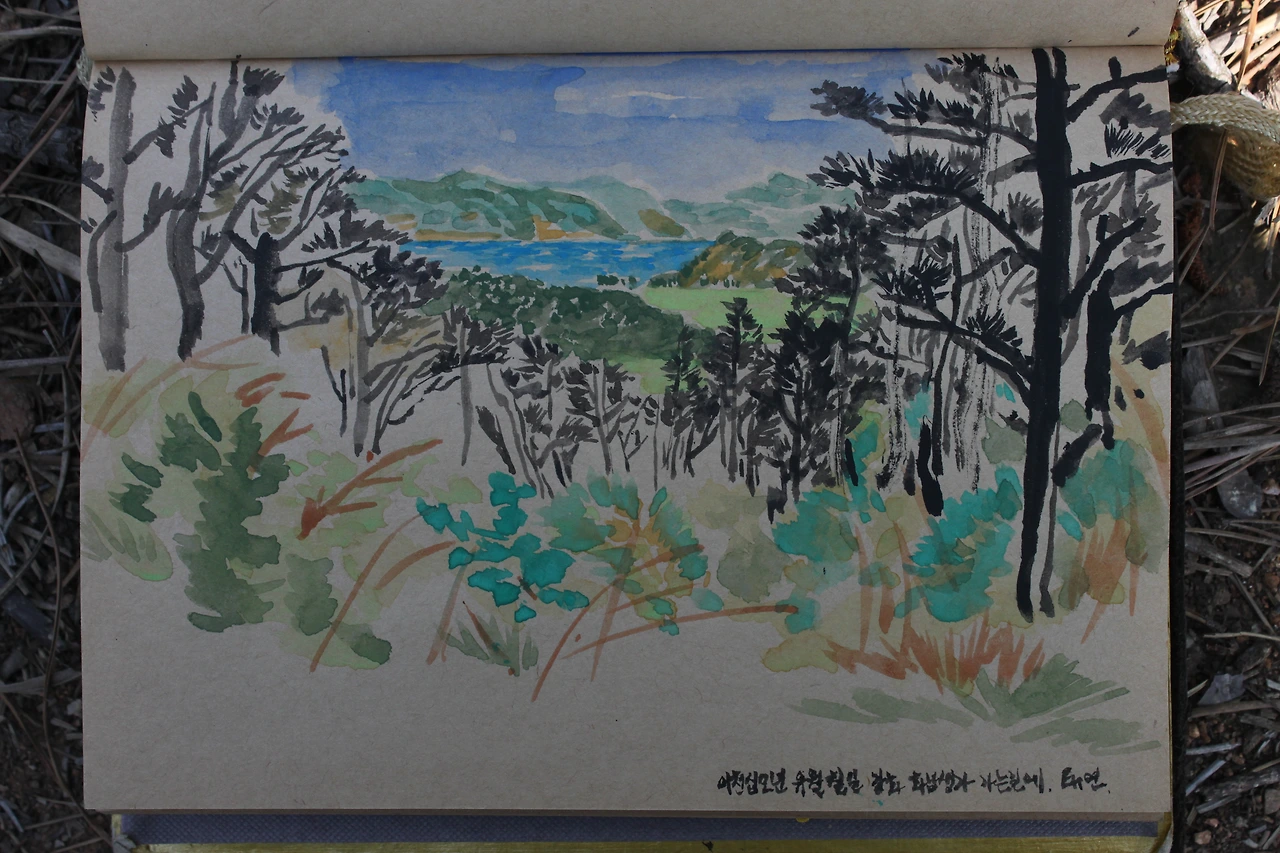 그래도 일주일 동안 기대하던 시간이라 급히 여장을 챙겨 발길을 옮겼다. 아이들을 생각해서라도 메르스와 거리를 둬야 하기에 밑에 쪽은 당분간 쉬었다가 가기로 하고 위쪽 위주로 가려 '강화도'로 가는 버스를 탔다. 터미널에서 바로 시작하는 6코스로 시작을 했다. 주스를 한병 물 대신 사고 나서 약수터로 가는 길을 찾아 나섰다. 약수터는 쉽게 찾았으나 물이 고여있어 장구벌레 유충이 의심되어 마시지 않고 산길을 넘어 넘어 마을과 바다가 보이는 곳에서 잠시 멈춰 서 스케치 북을 폈다.