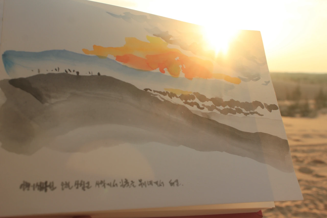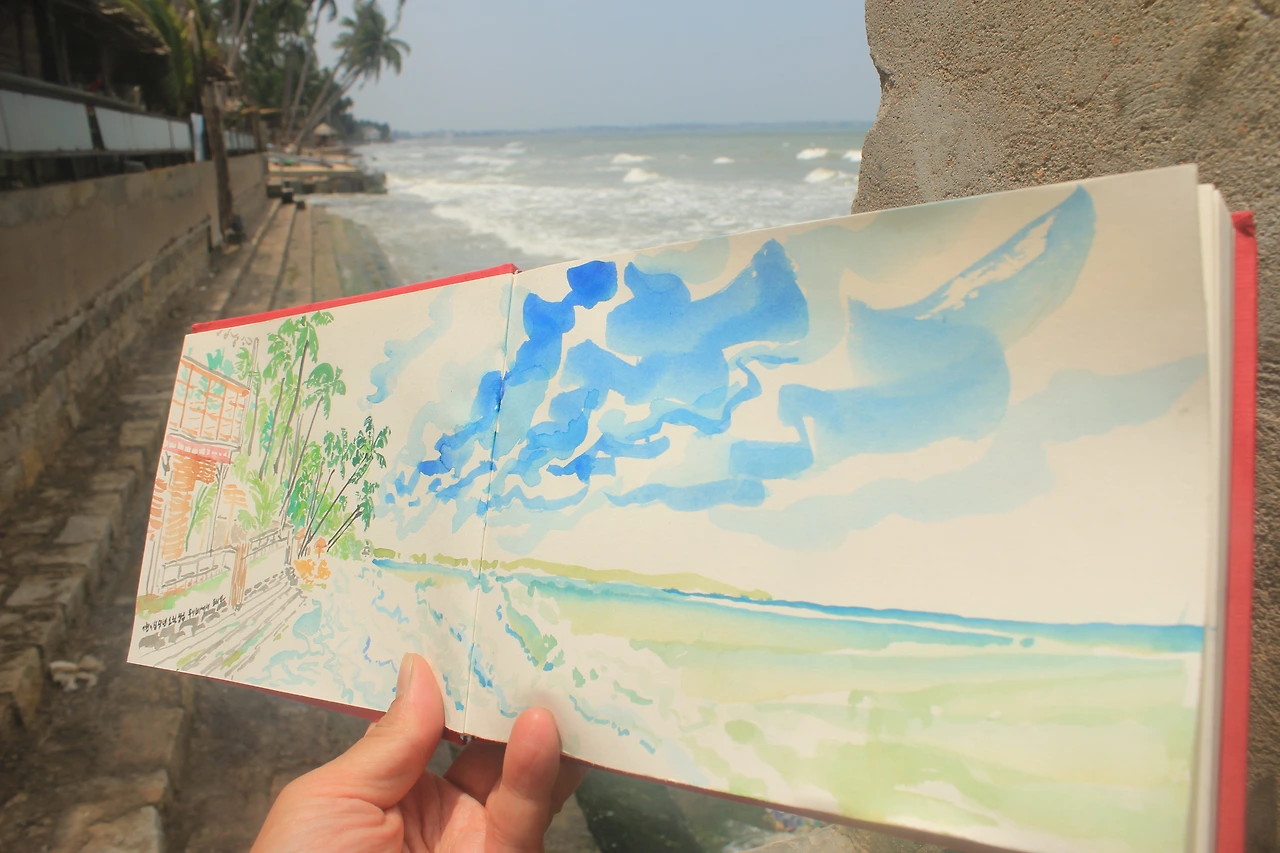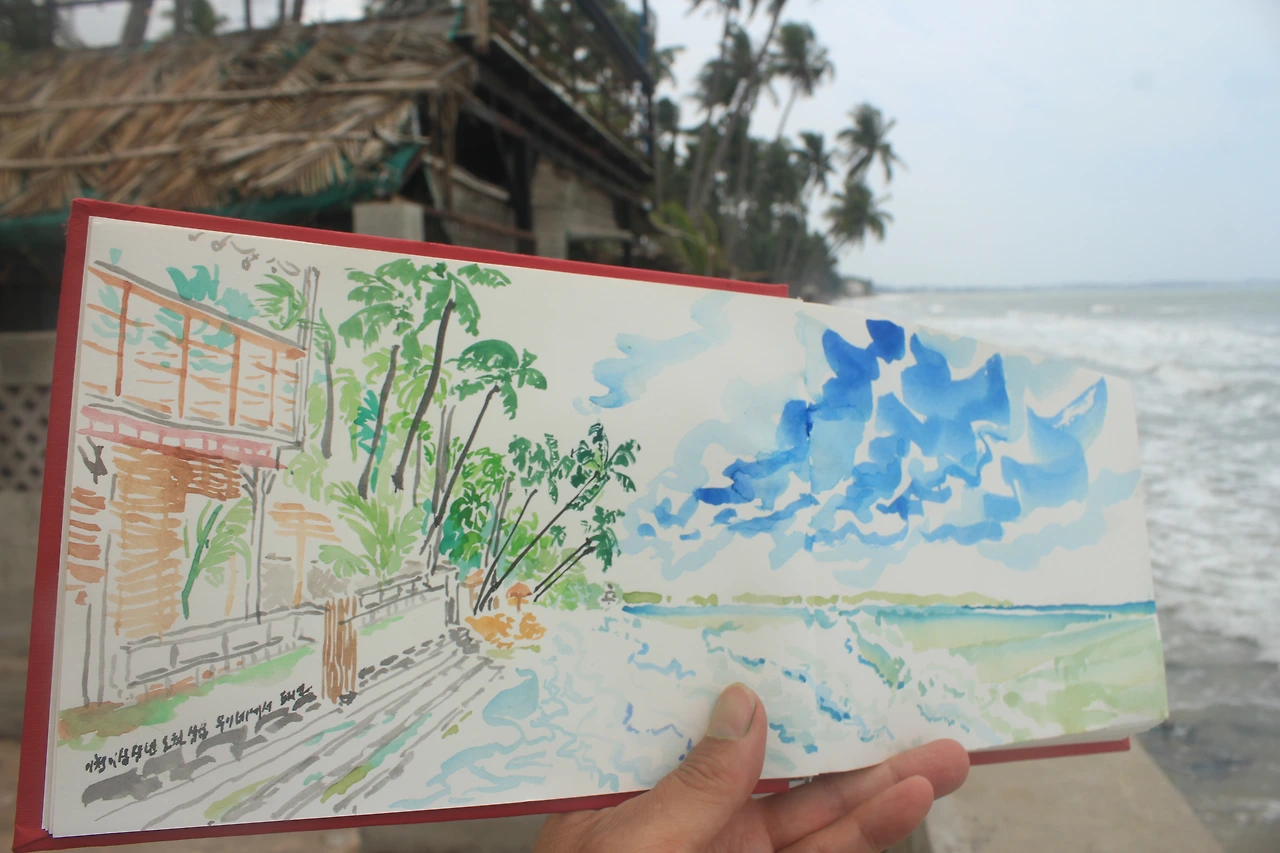 그 파도를 바라보다가 그림자가 있는 방파제에 앉아 스케치를 한다.
