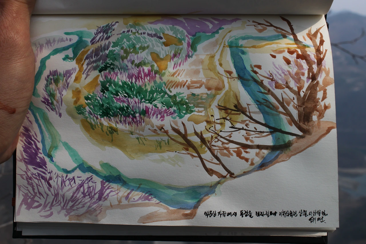 그렇게 아름다운 강과 꽃의 사진을 찍으며 올라간 5킬로 같은 2.5킬로를 올라 800여 미터에 육박하는 백운산 정상에 올랐다. 정상에서는 시야도 막혀있고 정상석과 돌탑만 있기에 간신히 오른 기념으로 그 주변에서 점심을 먹었다. 이제부터 좁은 절벽을 따라 능선길이 오르락 내리락이기에 조금 마음을 놓고, '칠족령'이 있는 곳으로 나아갔다. '칠족령'으로 가는 바위틈에서 굽이도는 물의 모습에 매료돼 얼마 남지 않은 시간에도 30분 시간을 쪼개서 스케치를 한다. 시간이 모자라서 바로 색으로 그려 버린다.