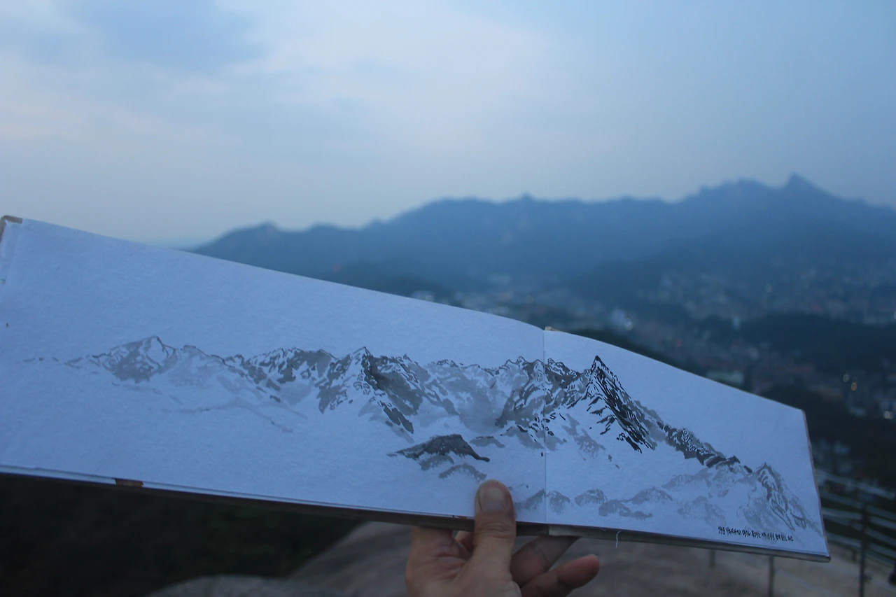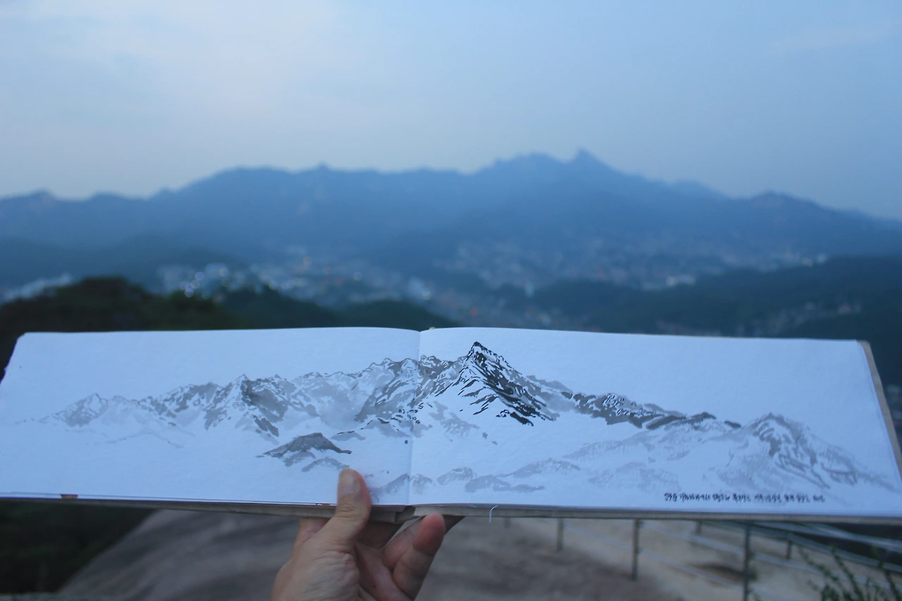 그곳에서 봄에 그렸던 수채 스케치와 달리 수묵으로 긴 화면에 작업해 보고 싶어 기차바위 오른편 큰 바위에 앉아 스케치북을 펼친다.