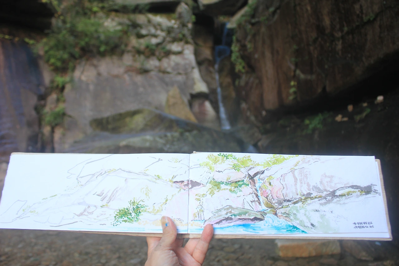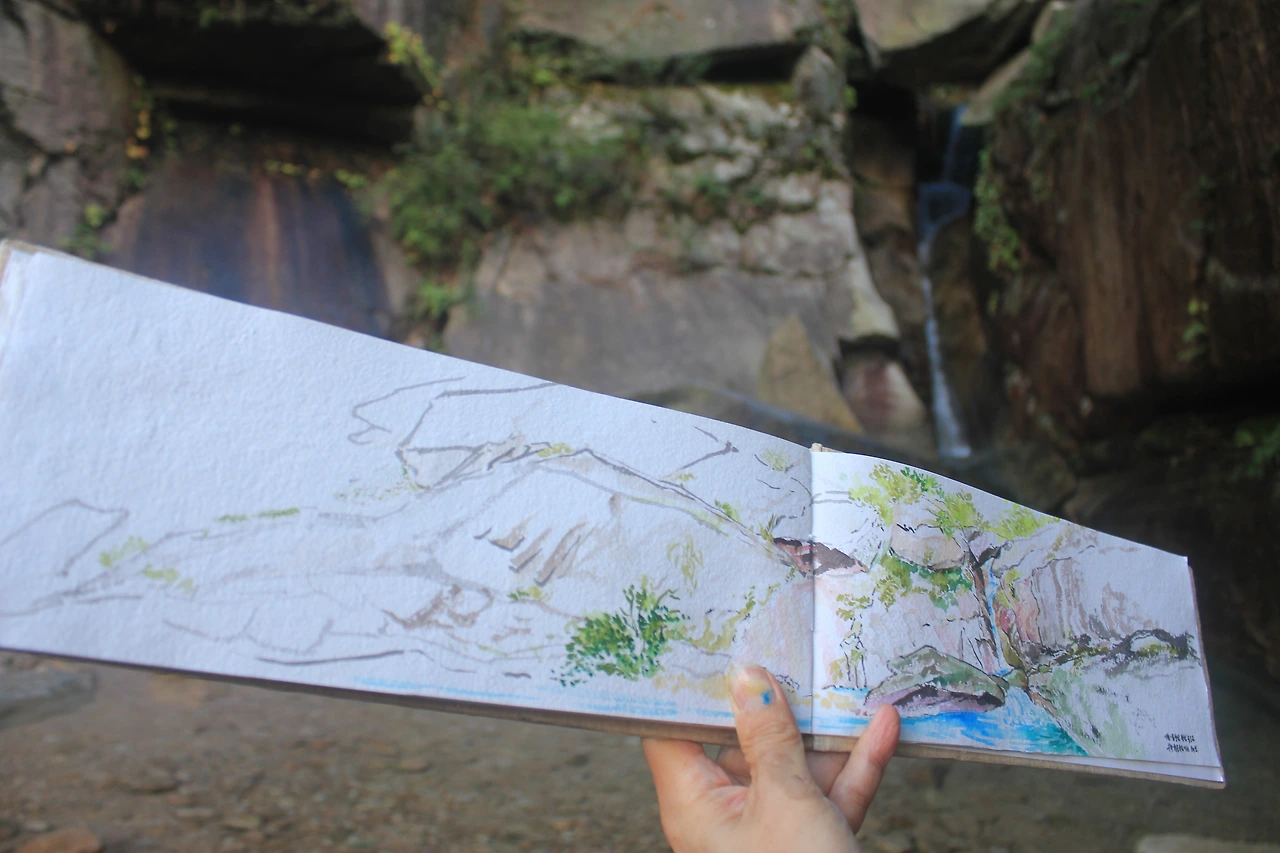계곡 바위를 타고 가다 쇠로 된 구름다리가 나와 그 다리 건너편으로 계곡으로 올라가다 샛길이 보여 그 샛길로 올라서니 보이는 '천문 폭포' 유명해진 이름값 덕분인지 70여 명 정도가 여기저기 꾸역꾸역 자리를 차지하고 있었고 나는 그 틈새바위에 앉아 스케치북을 편다.