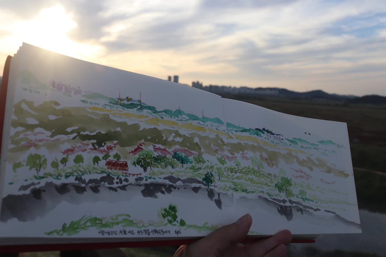 어지러움이 심해질 때쯤 마무리된 그림을 덮고 보니 뒤쪽으로 해가 떨어지기 시작한다.