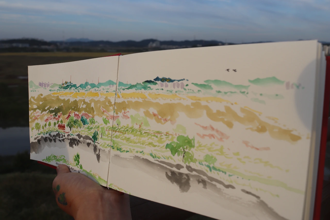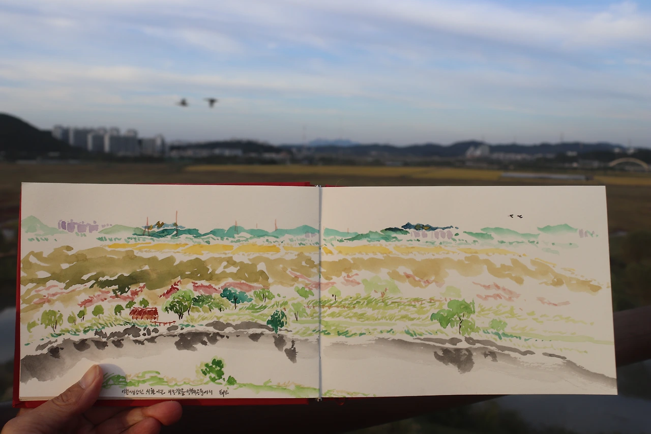 그 뒤로 염분이 있는 들판을 지나 노란 황금 들녘 뒤로 '북한산'과 '관악산'을 그린다.