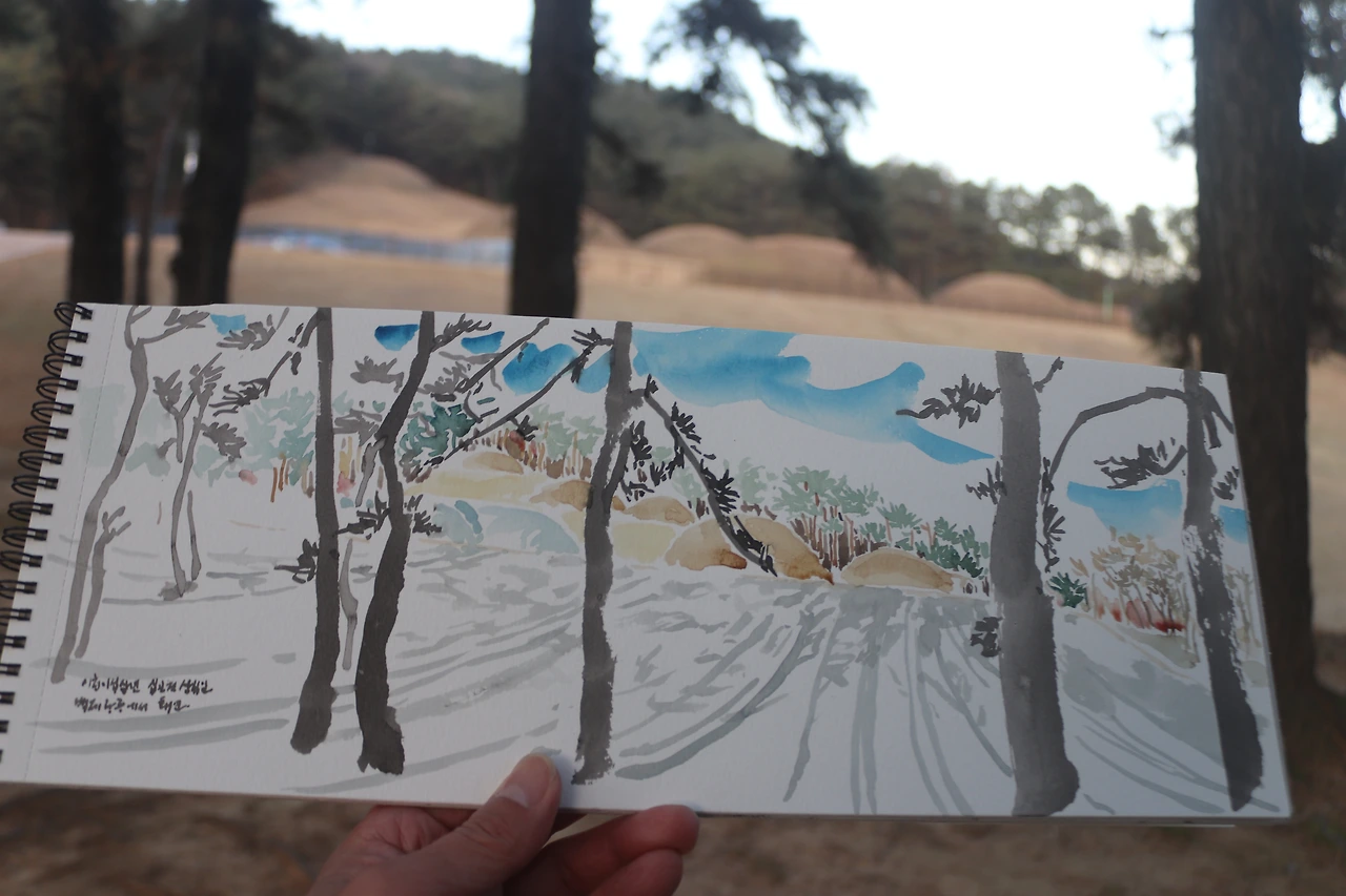 건너 벤치가 있는 솔숲에 앉아 능을 바라보다 소나무의 그림자가 능에 가 닿는 걸 보고 그 아름다움을 그린다.