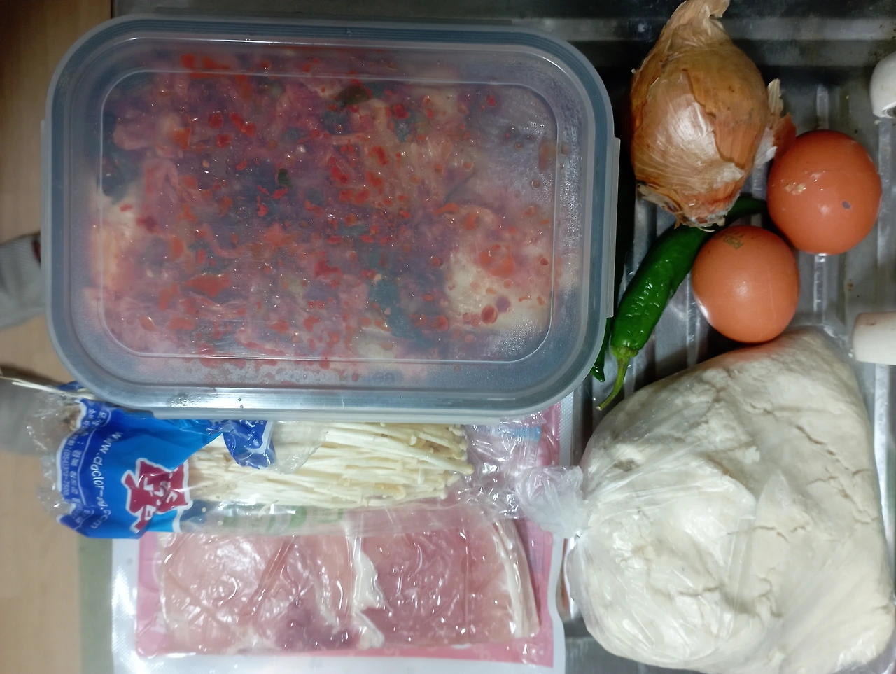 먼저 김치를 썰어 넣고 양파와 돼지고기 목살과 팽이버섯과 고추를 썰어 기름을 넣고 볶는다.