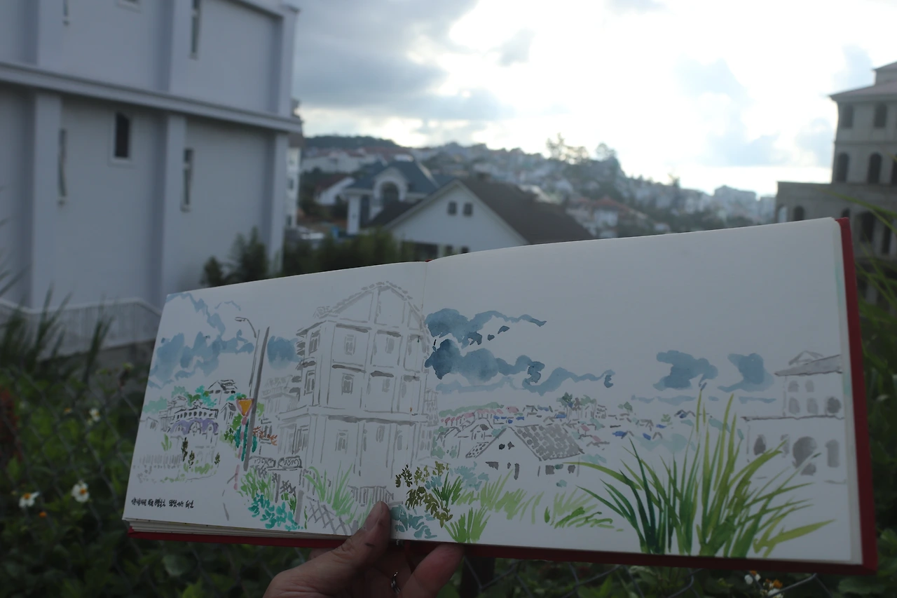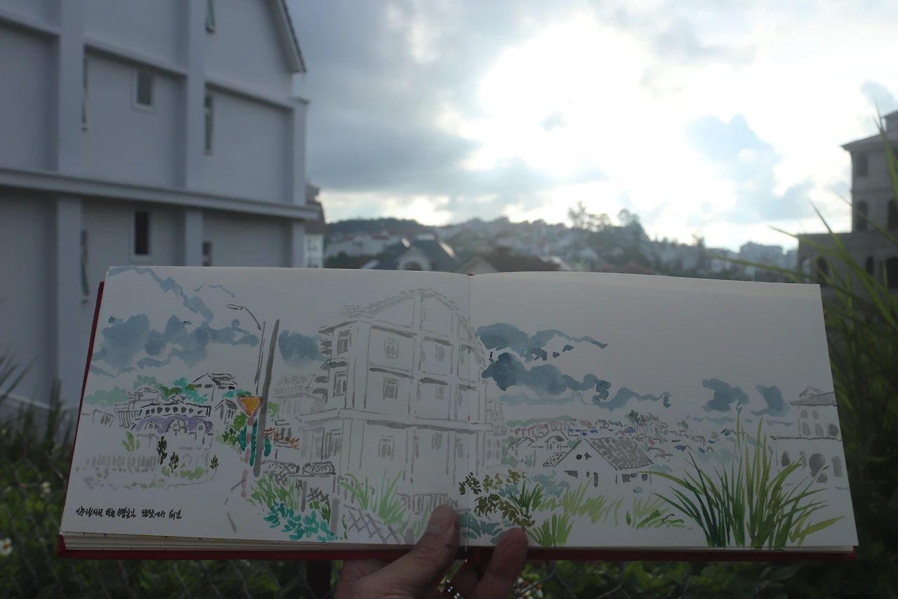 모두들 마사지를 받는 동안 달랏 시내 일부를 스케치한다.