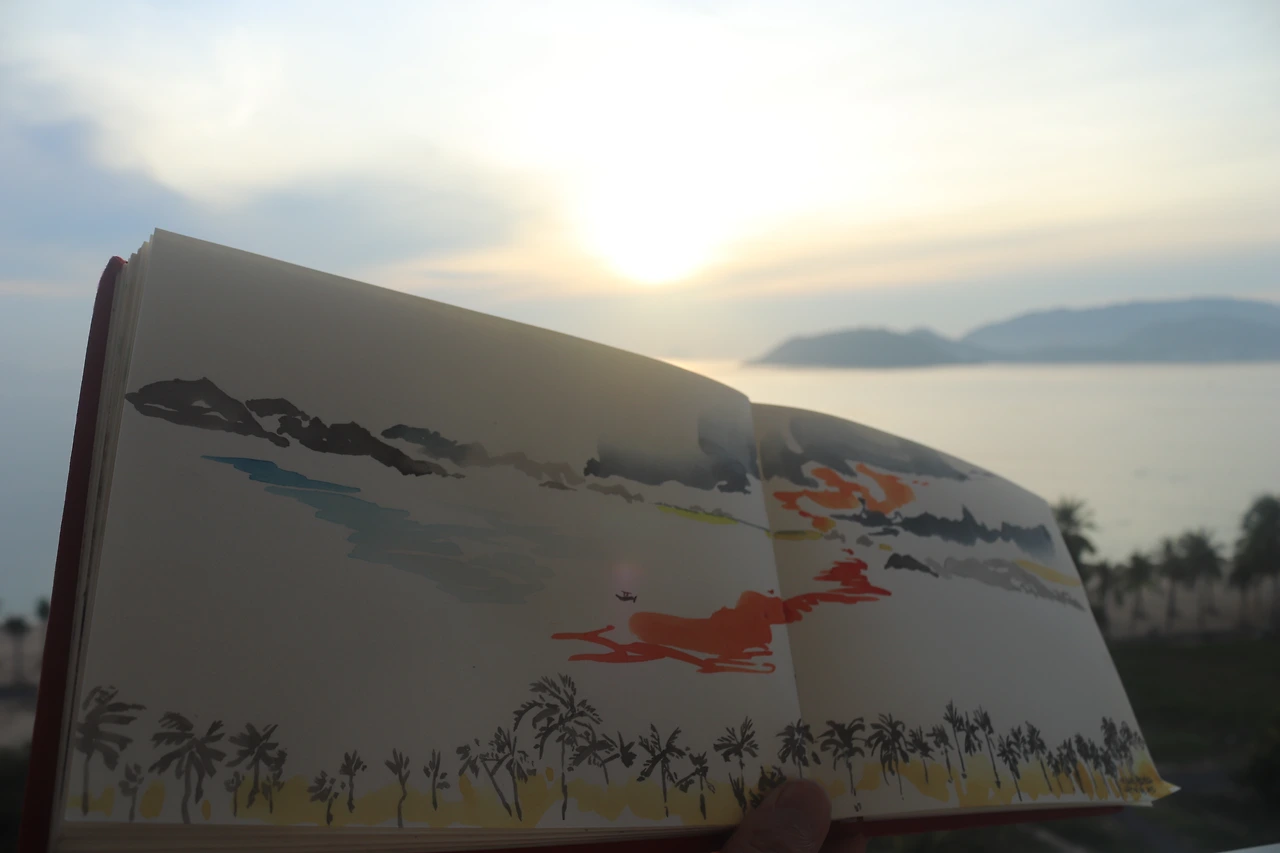 새벽 5시에 눈이 떠져서 분홍빛 일출을 보고 스케치한다.