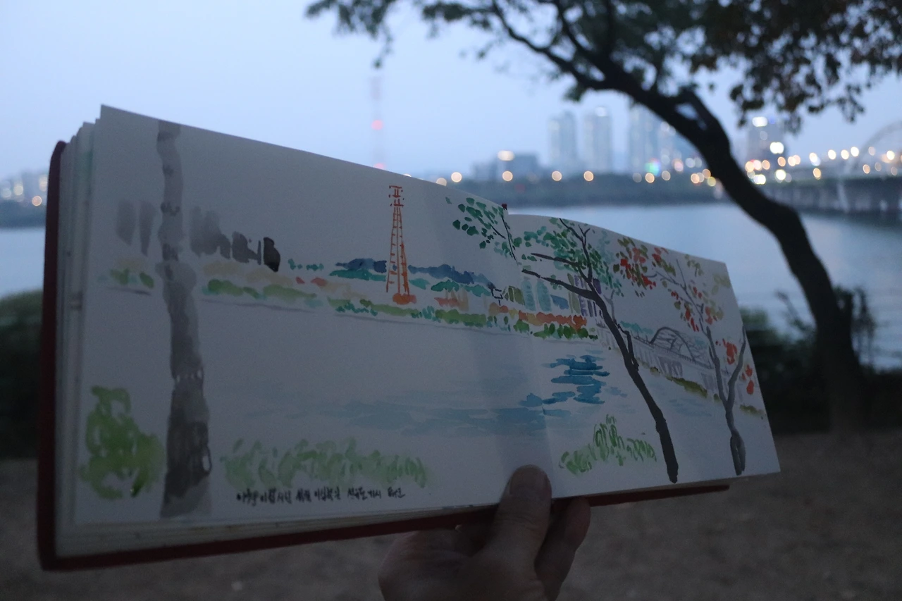 가을이라 어둠이 빨리 달려와 쫓기듯 30여 분에 크로처럼 그린 스케치엔 조금함과 함께 선유도에서 바라본 한강변의 여유로움도 담겨있다.