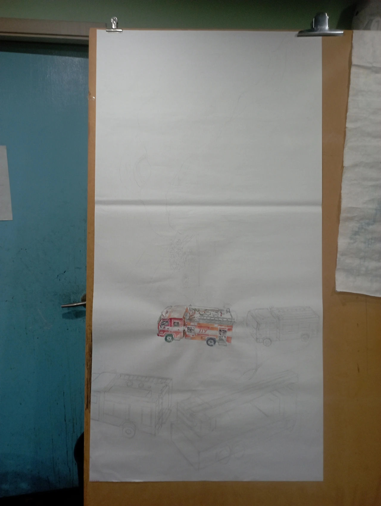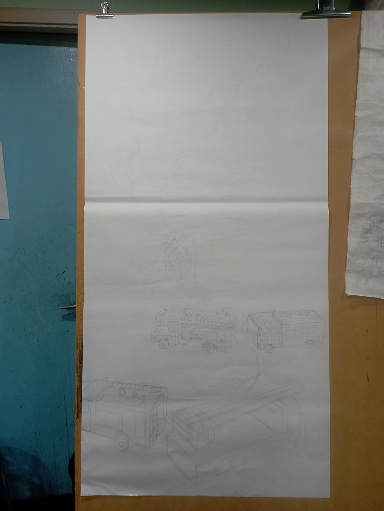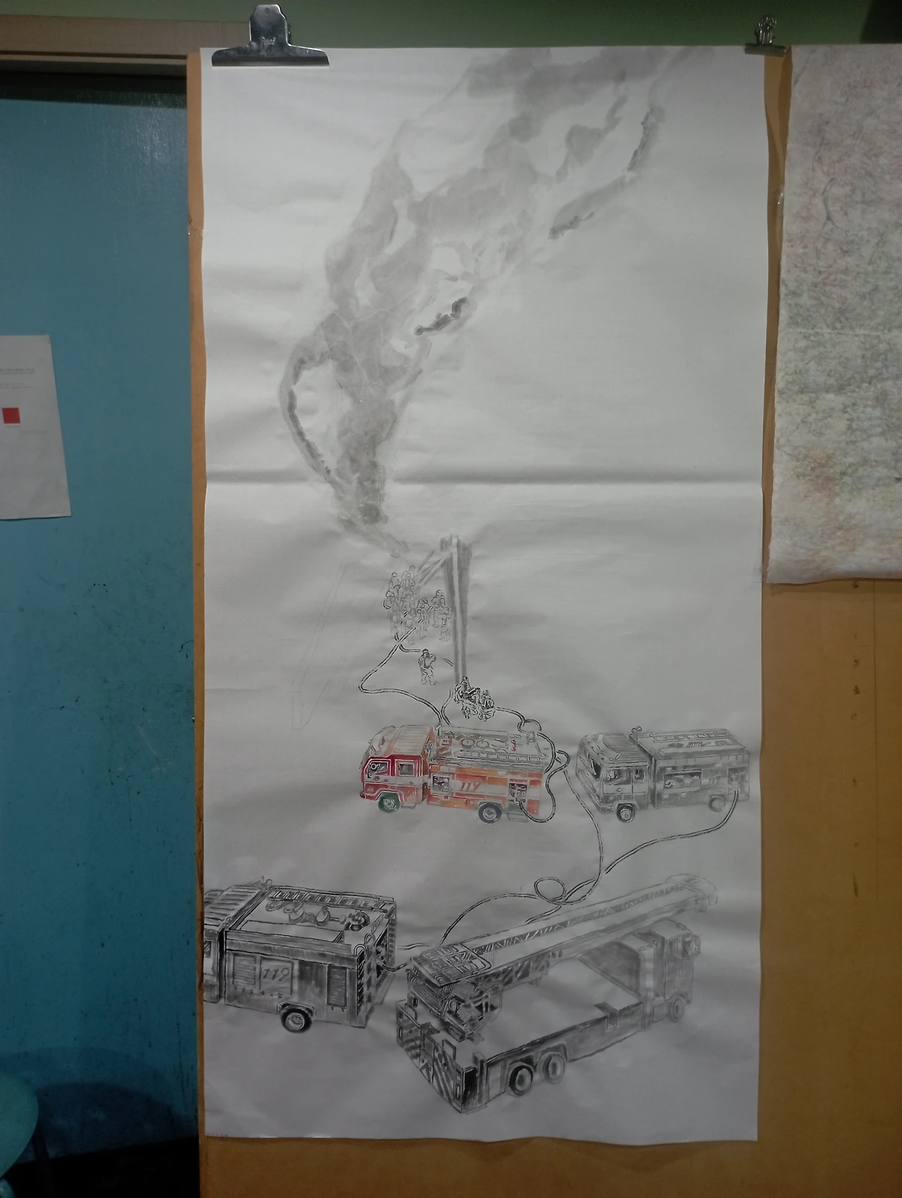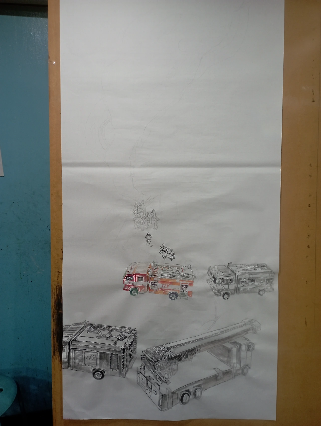 1, 스케치를 한다. 실제 화재 현장에서의 생생함을 기록하고 상황을 묘사하기 위해 정리되지 않은 듯 유연한 S자 구도로 상황을 배치시킨다.