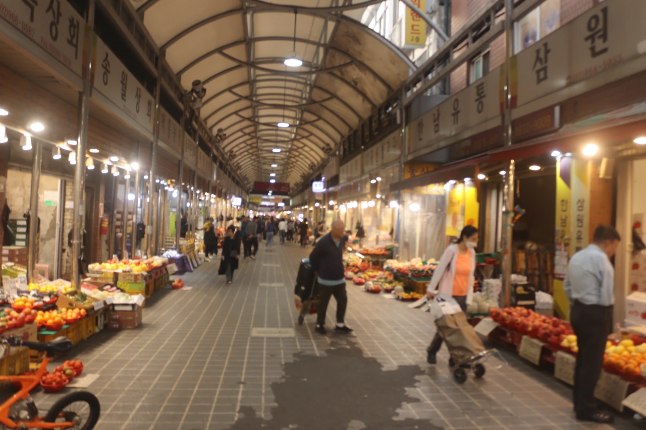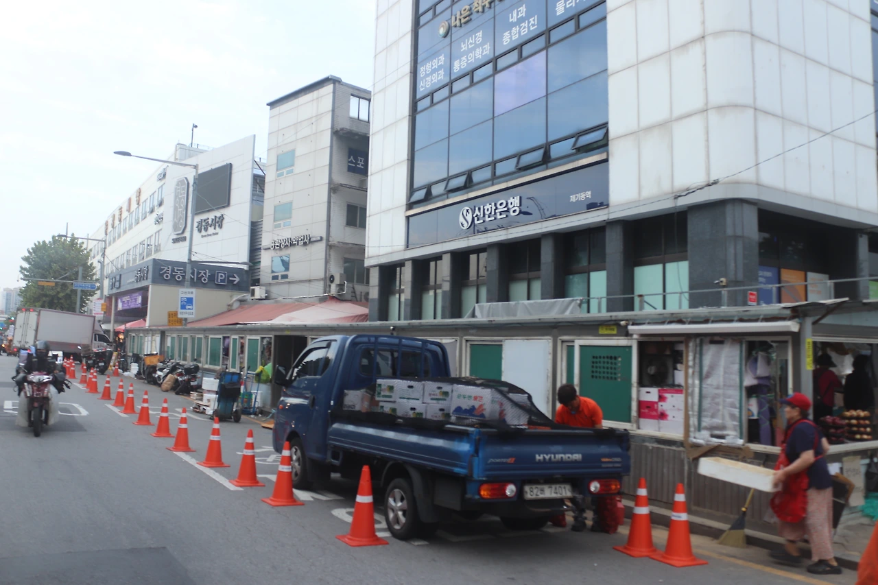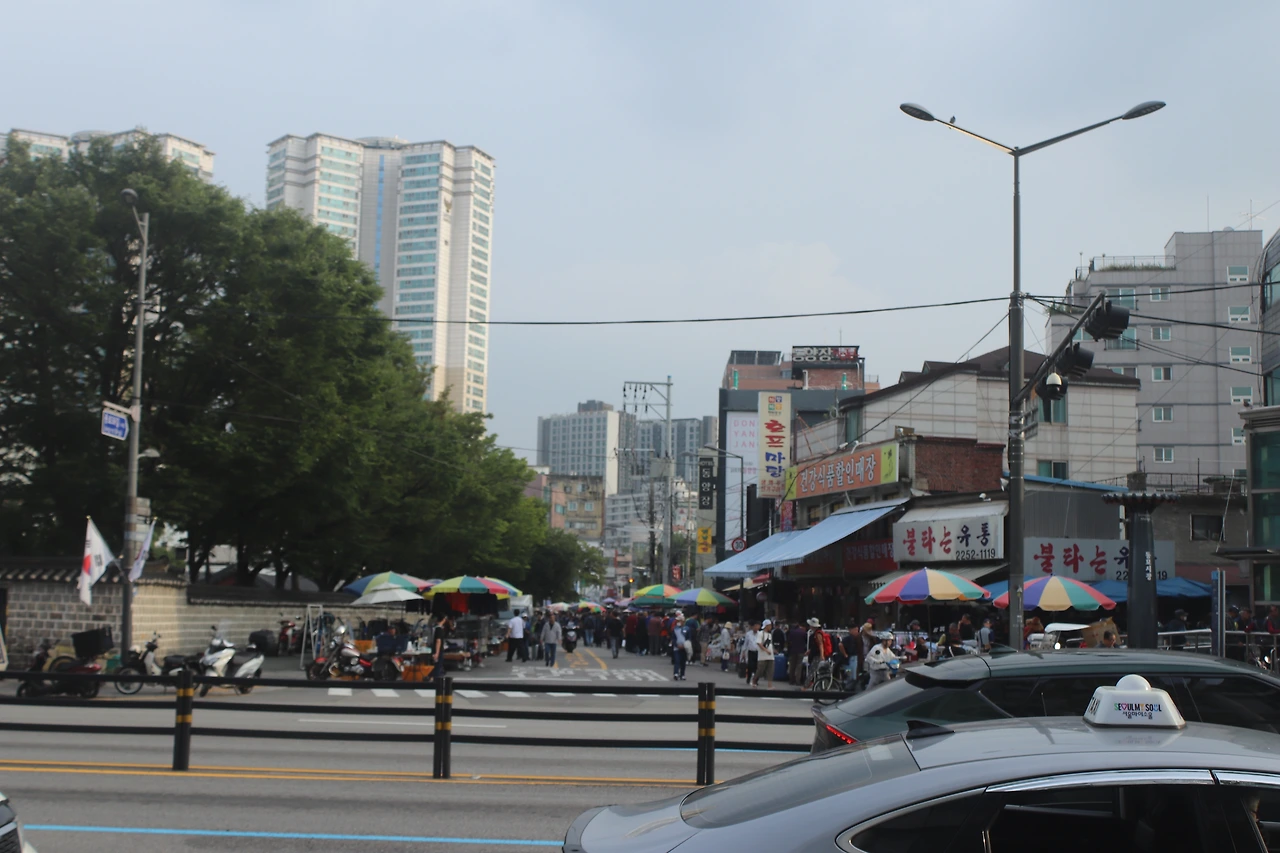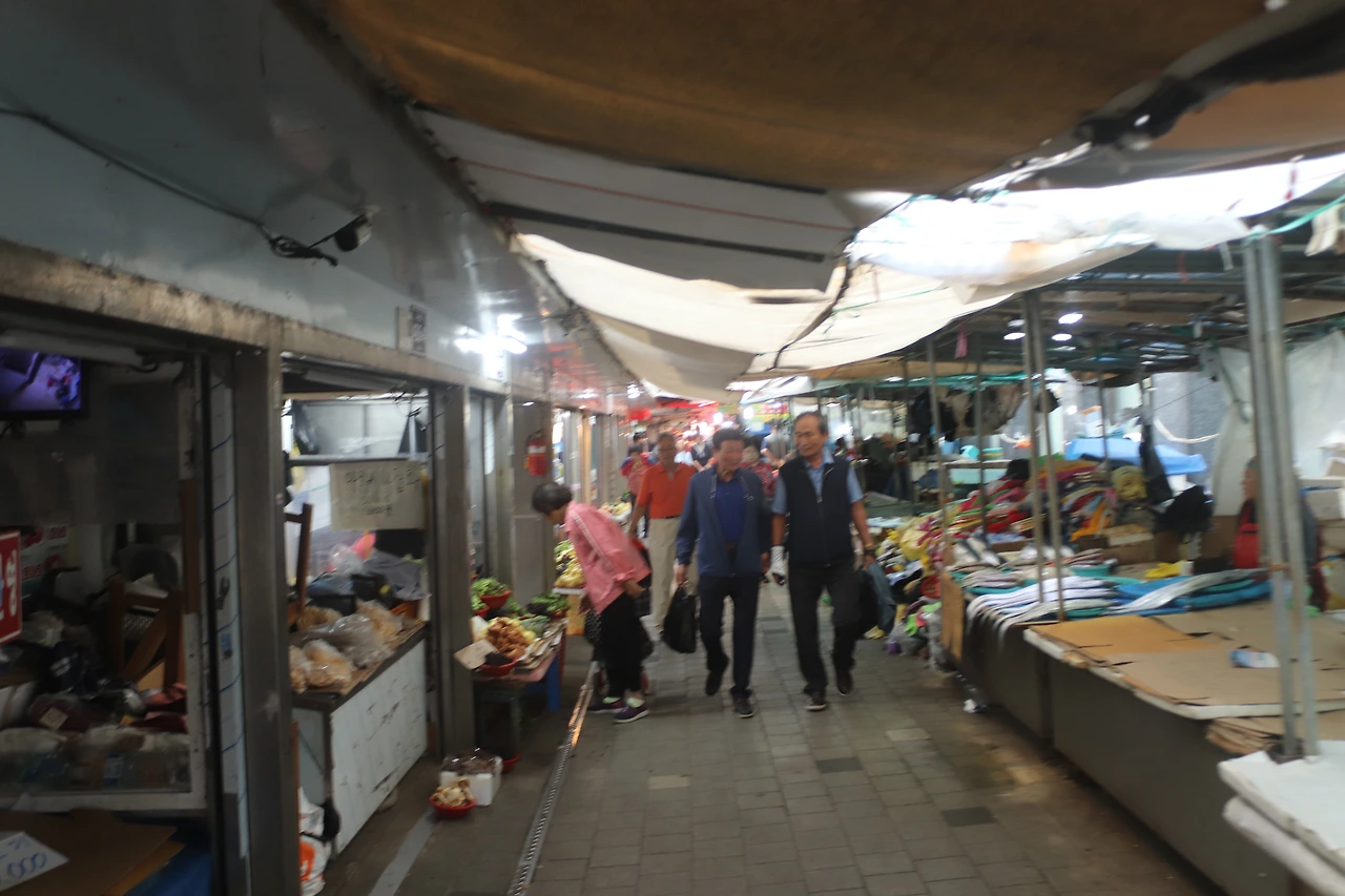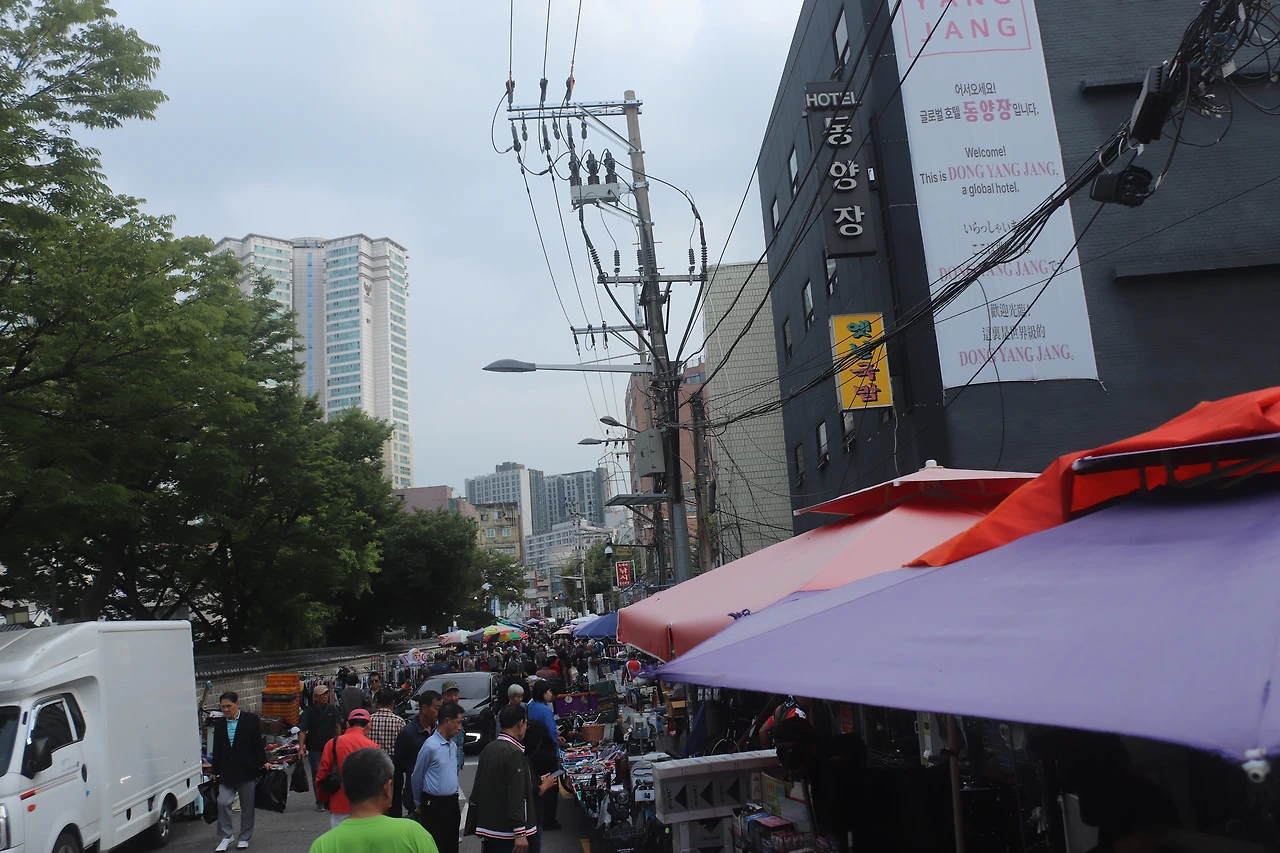 동부 간선도로 밑으로 지나 '제기동 약령시장'에서 약재 냄새를 맡으며 지나 '경동시장'에서 구경하다 번데기를 구입한다.