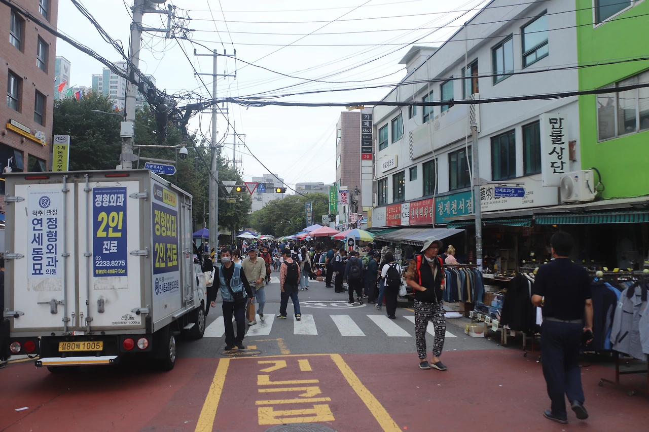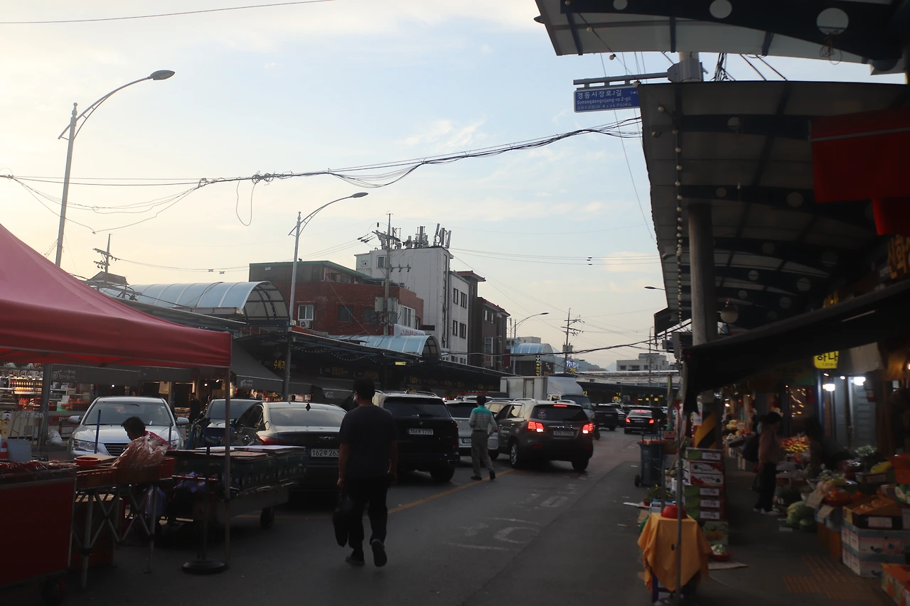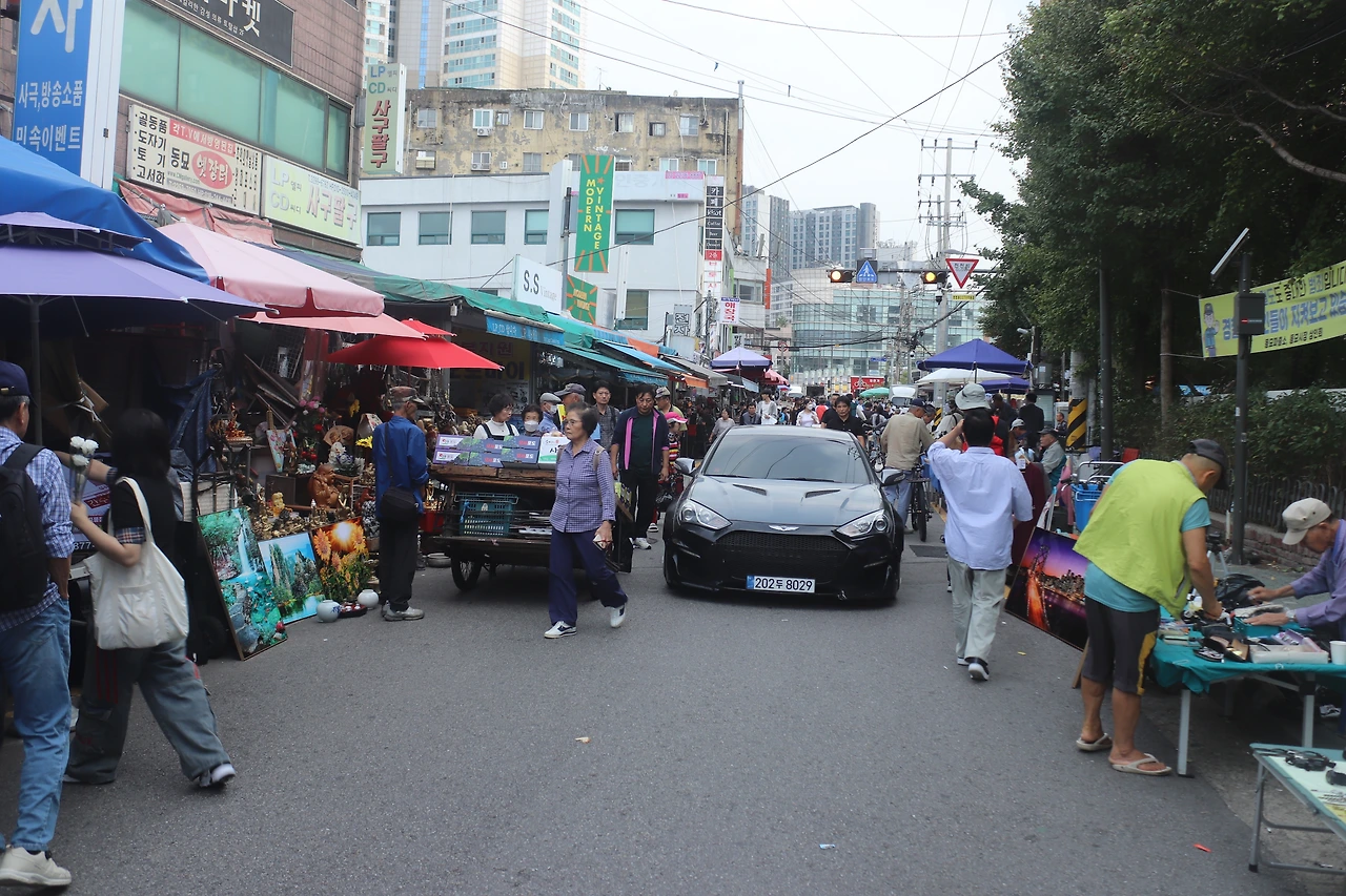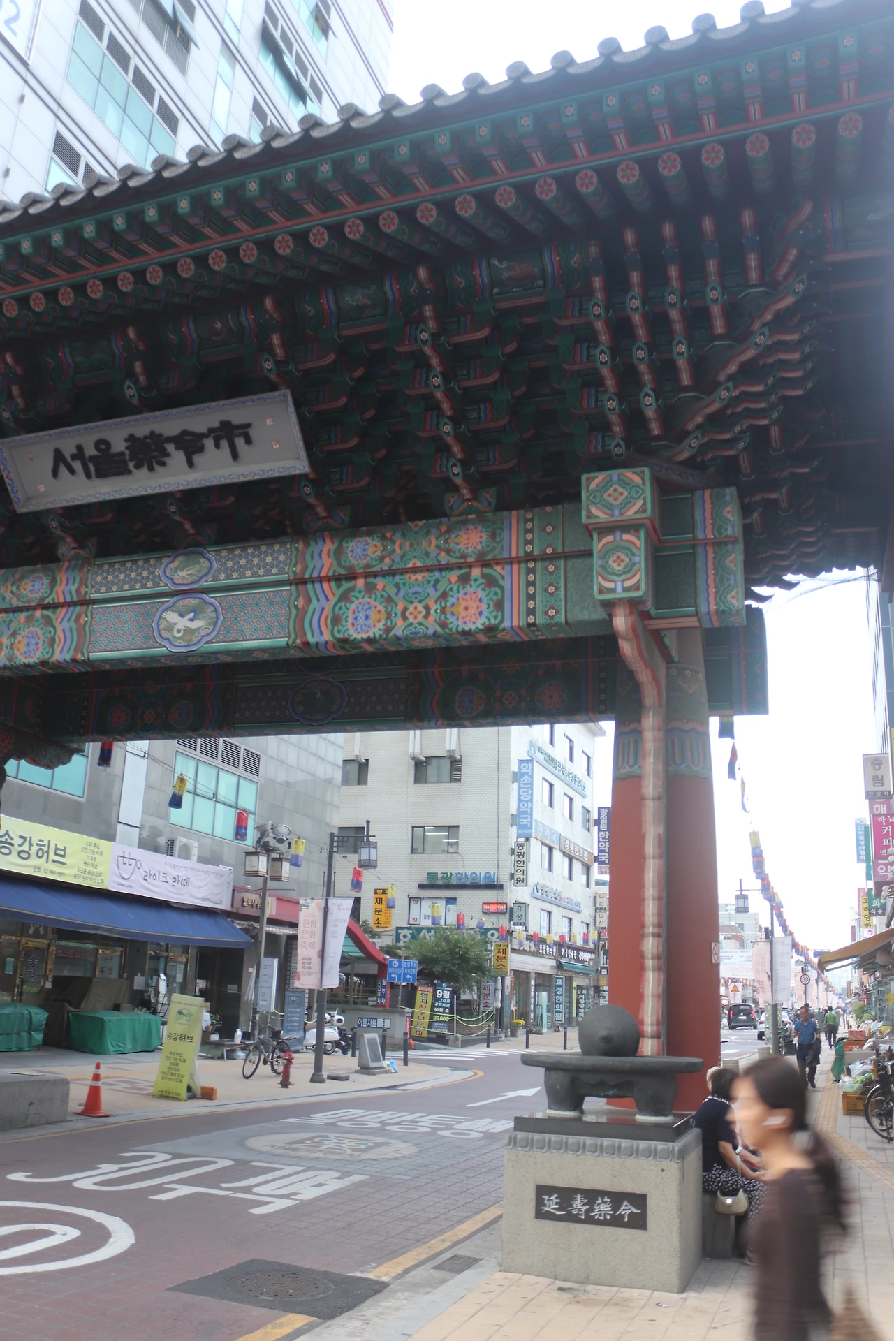 동부 간선도로 밑으로 지나 '제기동 약령시장'에서 약재 냄새를 맡으며 지나 '경동시장'에서 구경하다 번데기를 구입한다.