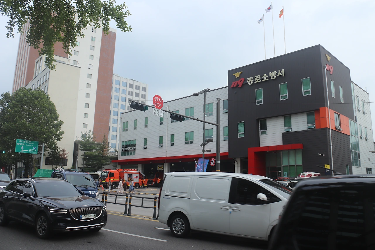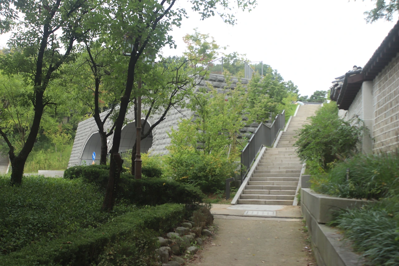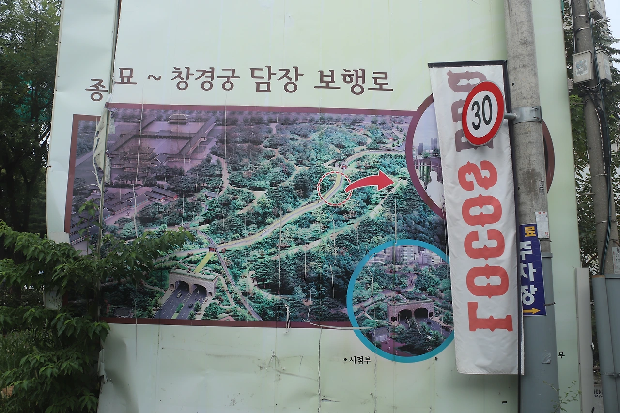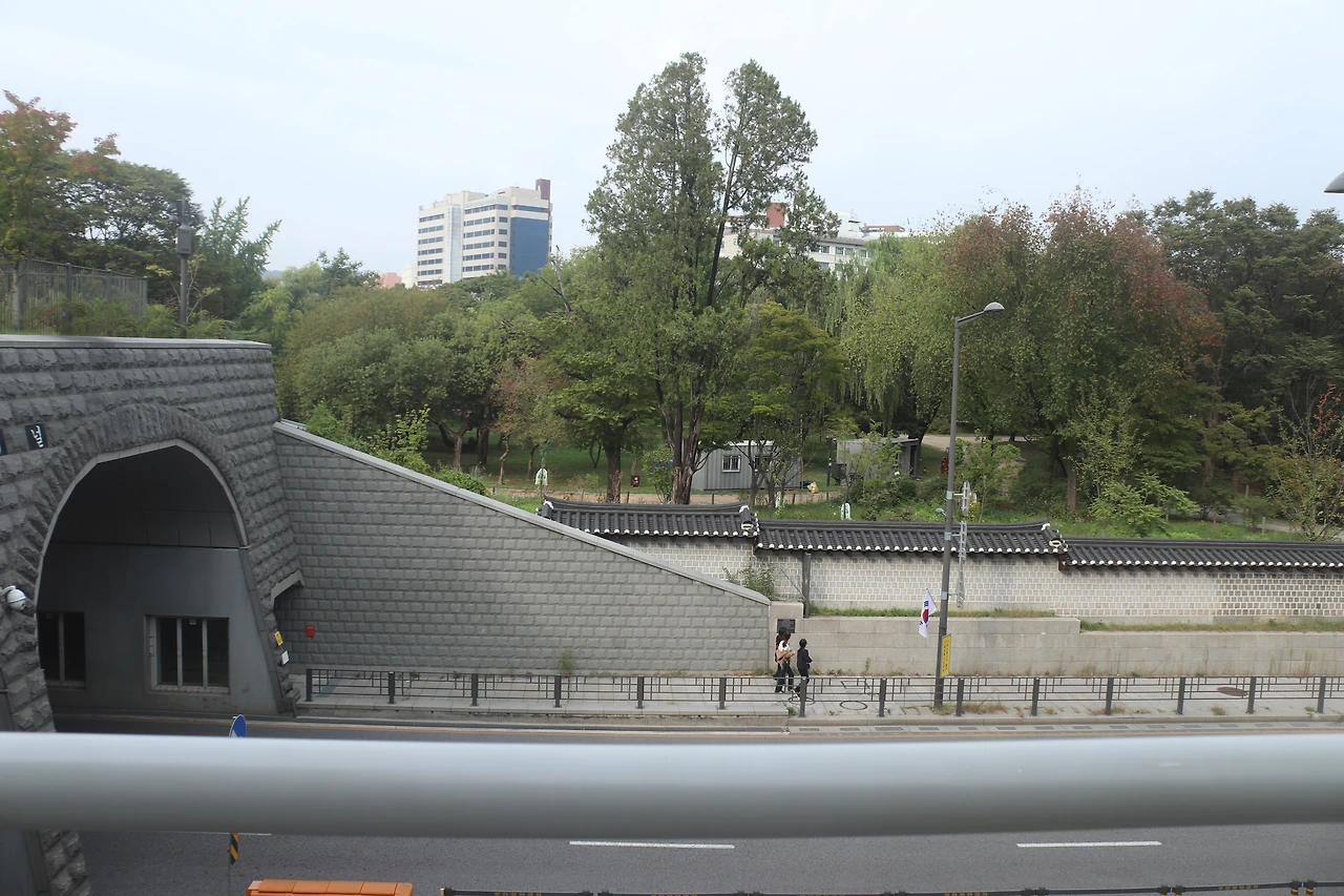 현대 사옥 지나 요즘 뜨고 있는 '서순라길' 입구를 지나 공사를 하고 있는 '돈화문' 너머 '율곡터널' 앞에 선다. 전에는 터널 내 인도로 지나갔었는데 창경궁과 종묘사이 길이 새로 생겼다 해서 그 길로 올라선다.