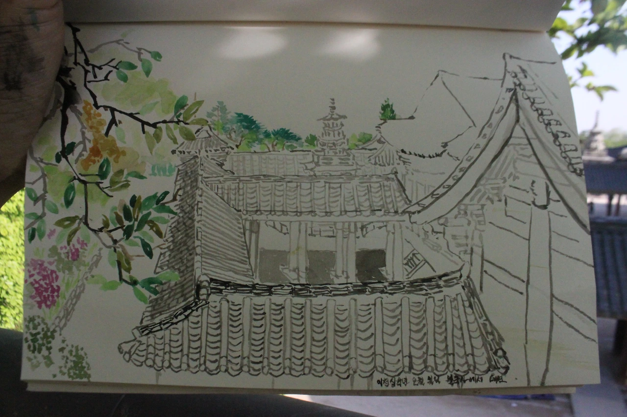 그사이에서 오래전 보았던' 다보탑'과 '석가탑'을 재회하고 경내를 돌다가 '관음전' 뜰에서 보는 불국사의 모습과 다보탑의 모습에 매료되어 친구를 먼저 보내고 한 시간여 스케치를 한다.