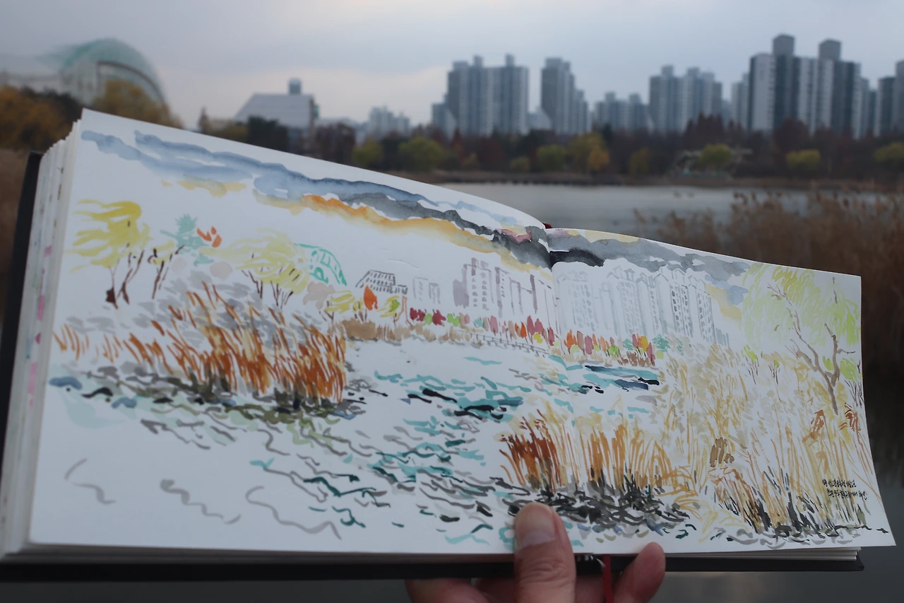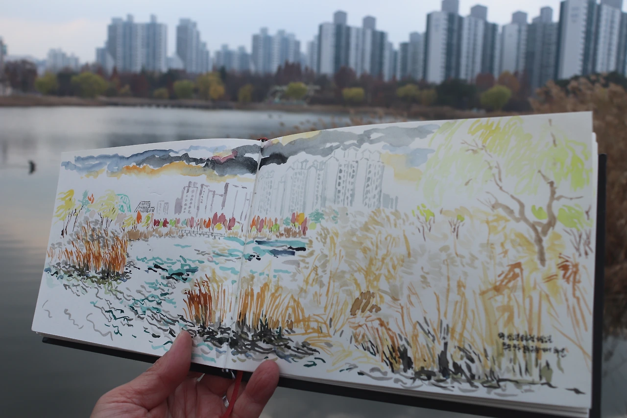 일층과 이층에서 바라보는 밀림의 공간은 마치 다른 세상에 만들어진 특별한 공간인 듯 보인다. 이층 둘레로 만들어진 조망다리를 걸은 뒤 식물원을 나온다. 다시 현실로 나오니 계절도 바뀌어 있다. 호수 한편 데크에 서서 갈대와 어우러진 호수를 바라보다 스케치북을 펼친다 하늘이 구름이 햇살이 변화하며 살아있는 것처럼 보인다 그 변화하는 하늘과 붙어있는 호수를 애써 분리하며 종이에 복사해 본다