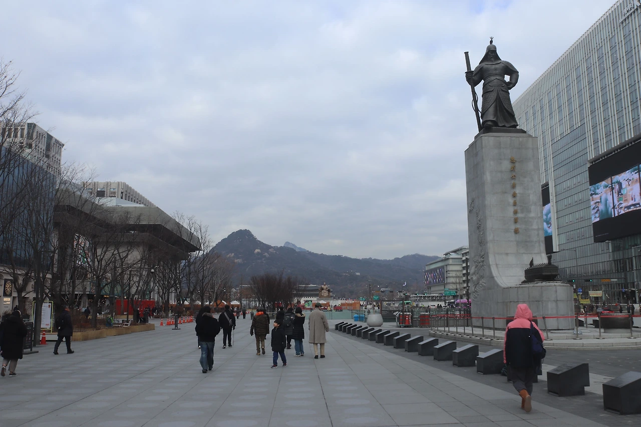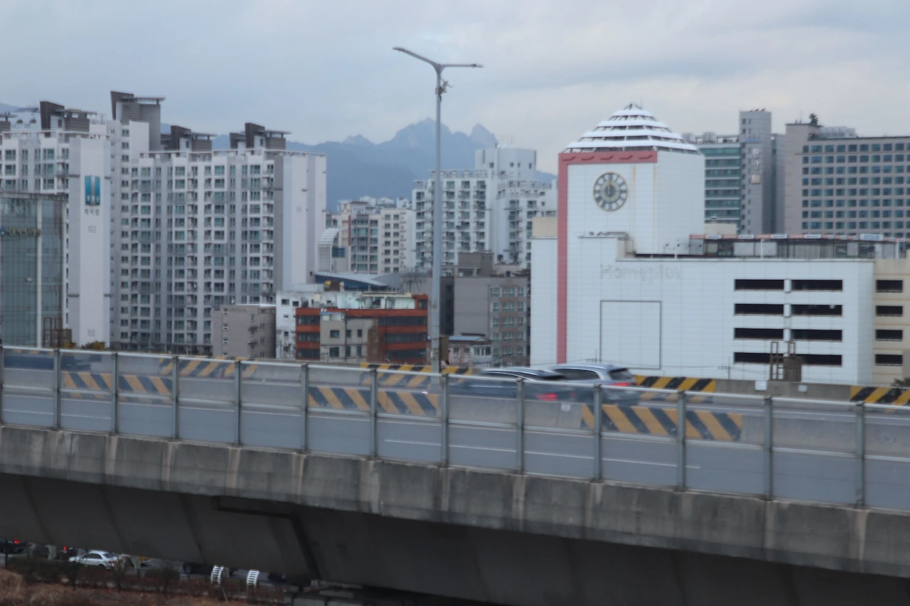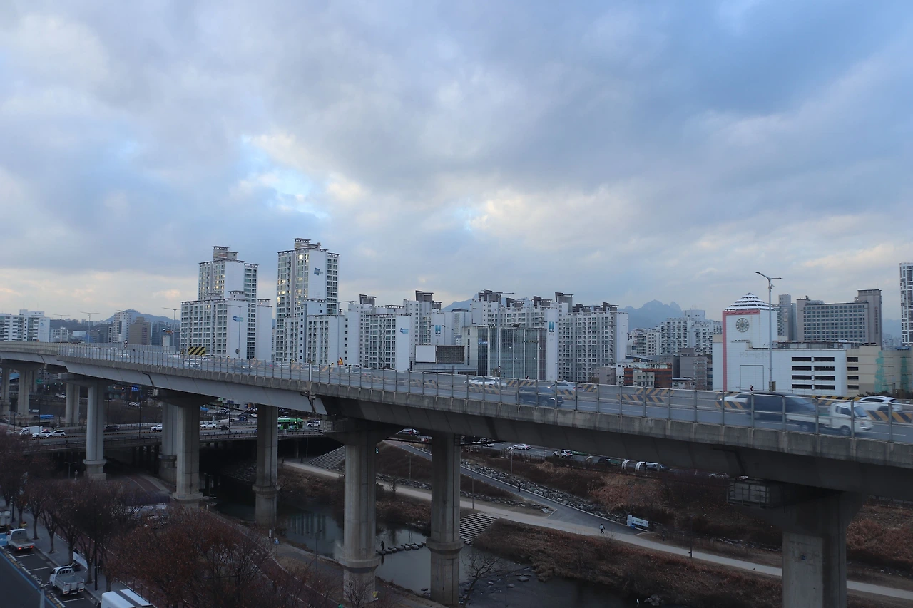 동대문구청과 이제 간판을 떼어버린 홈플러스 건물 뒤로 북한산이 펼쳐져 있다.