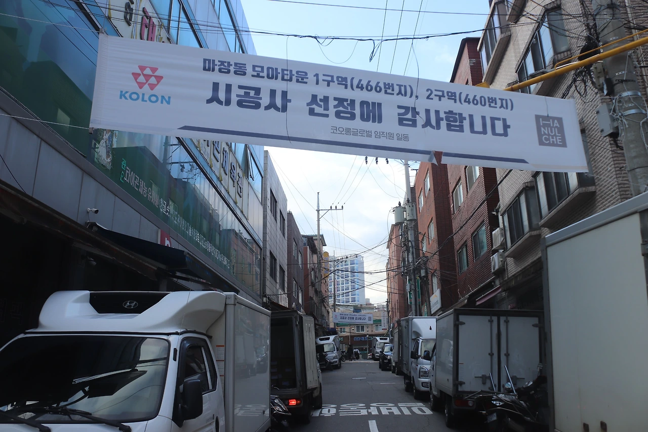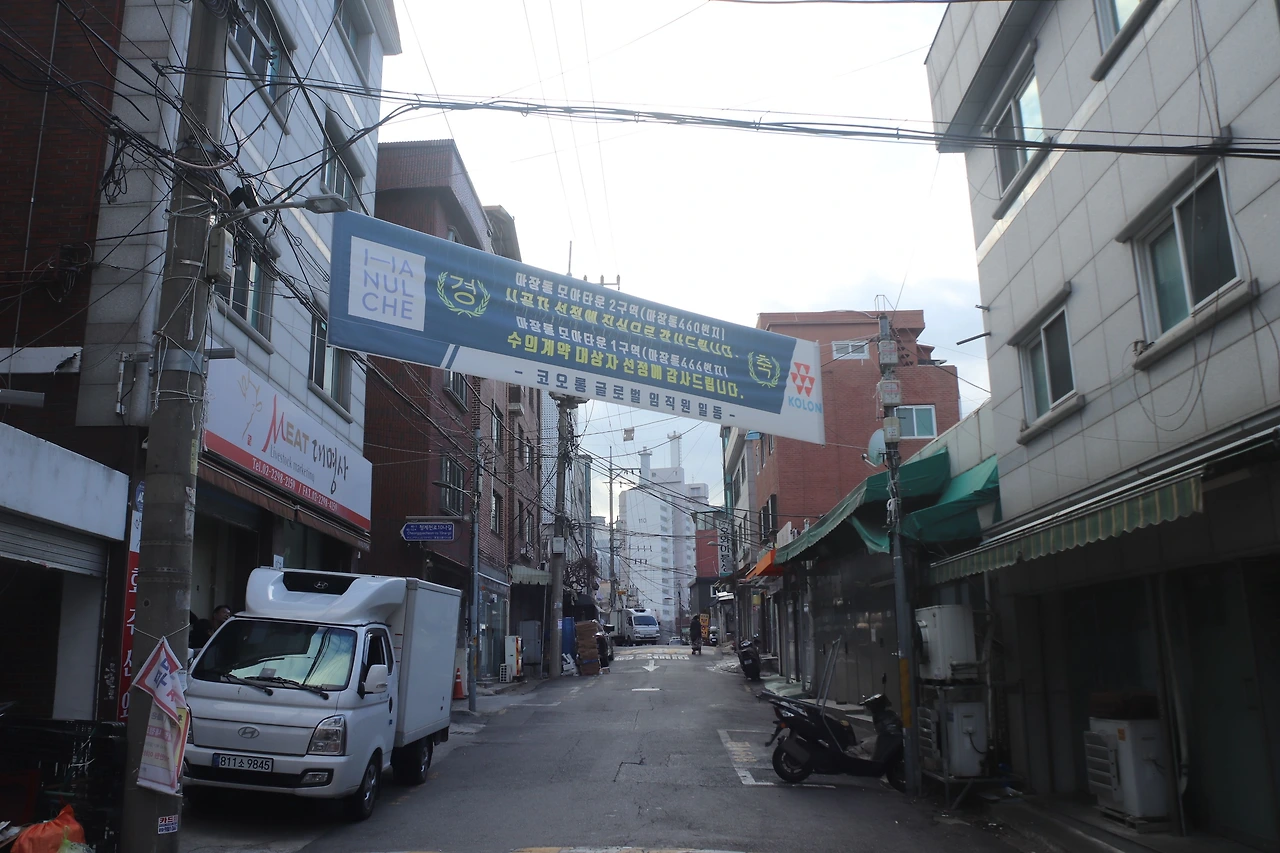 동네 깊숙이 들어가면 요즘 유행하는 소규모 재건축 단지로 지정되었다고 플래카드가 펄럭인다