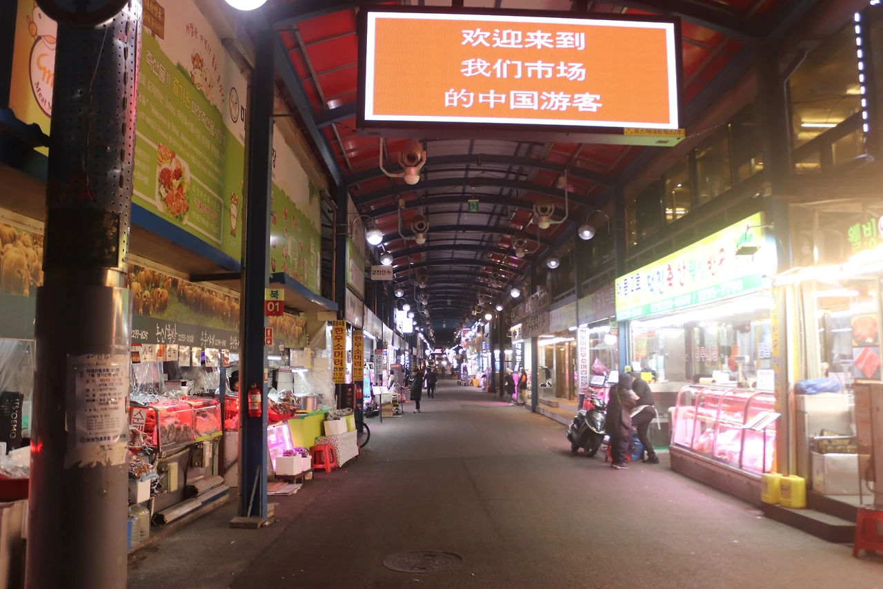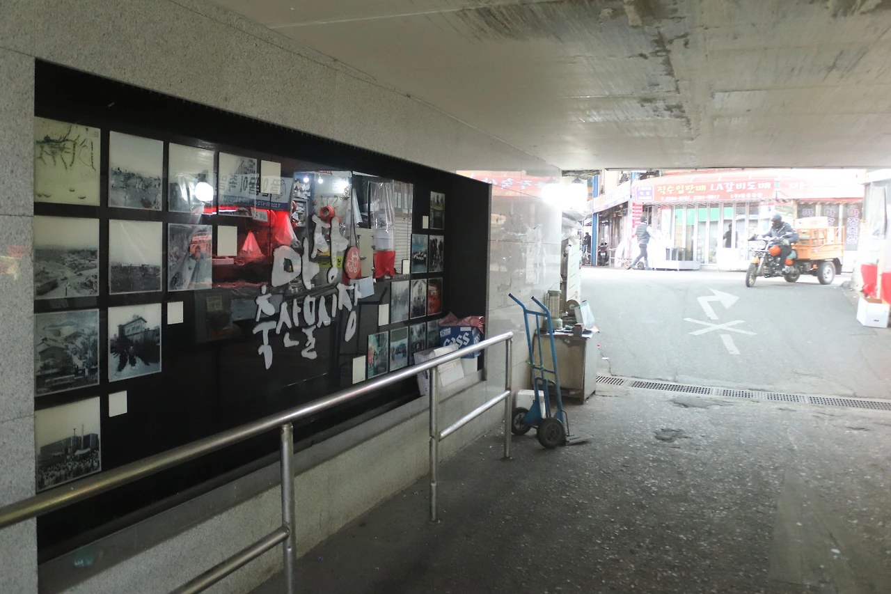 붉은색 조명과 색깔에 눈이 피곤해 시장 끝 청계천 방향으로 나온다