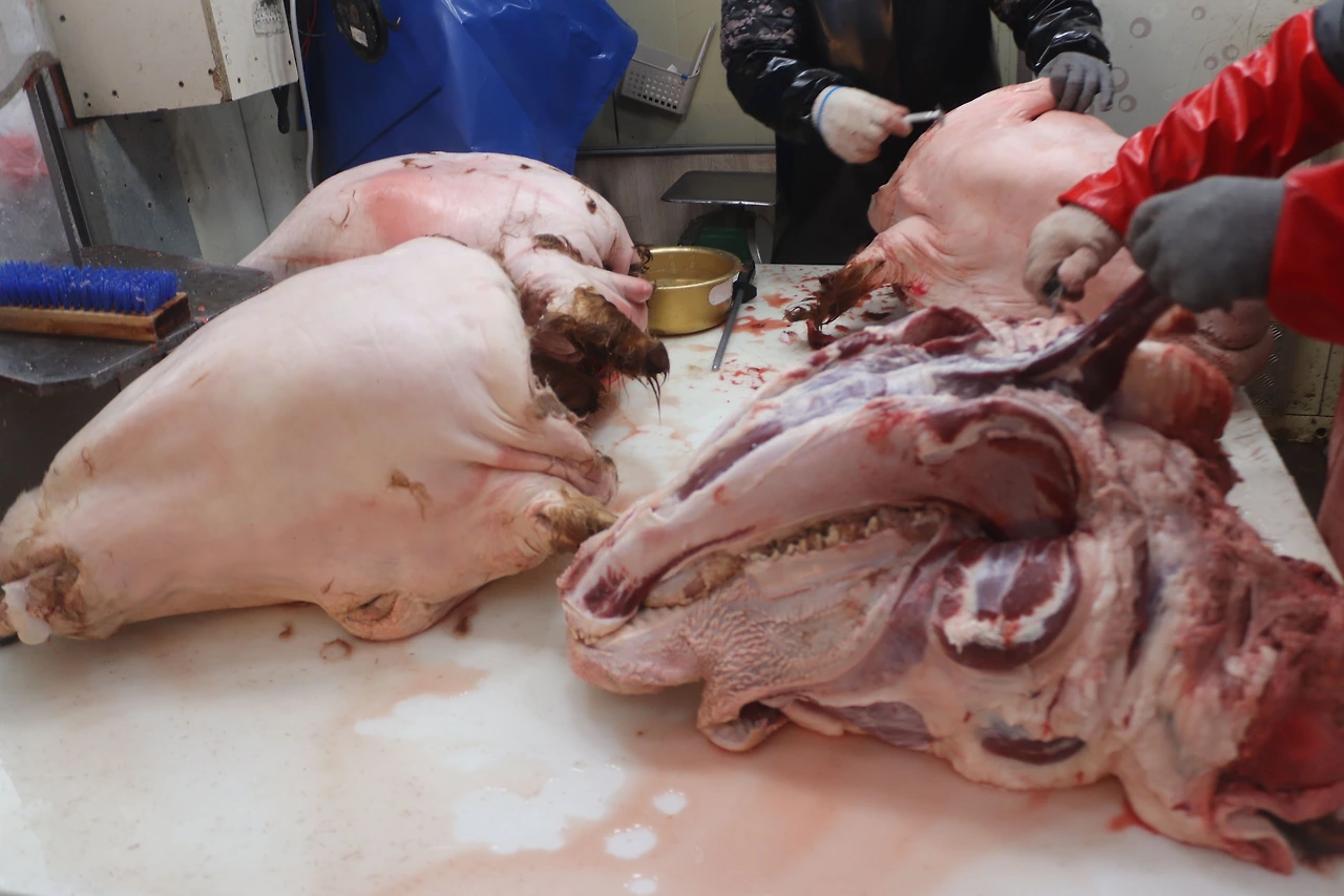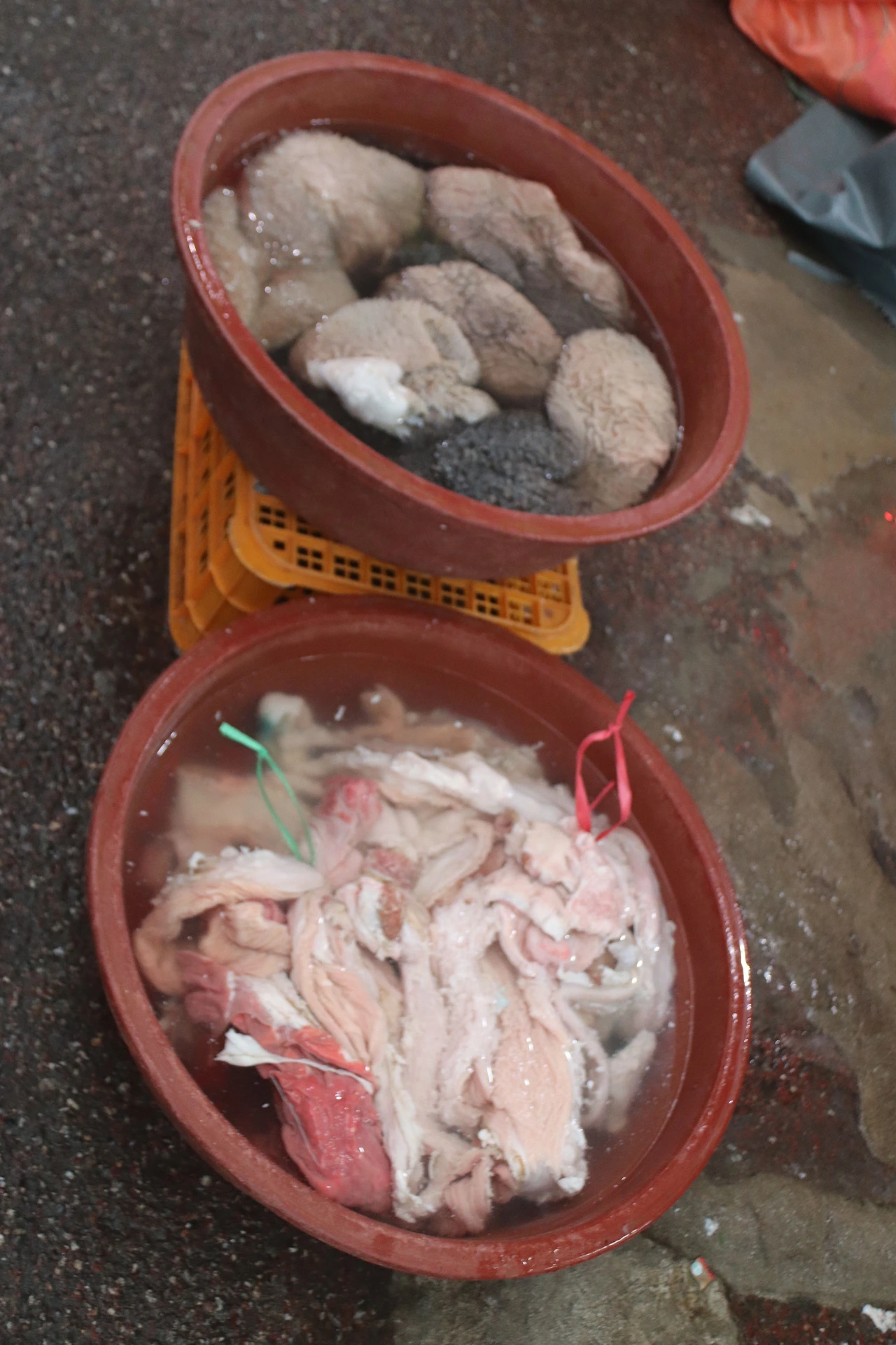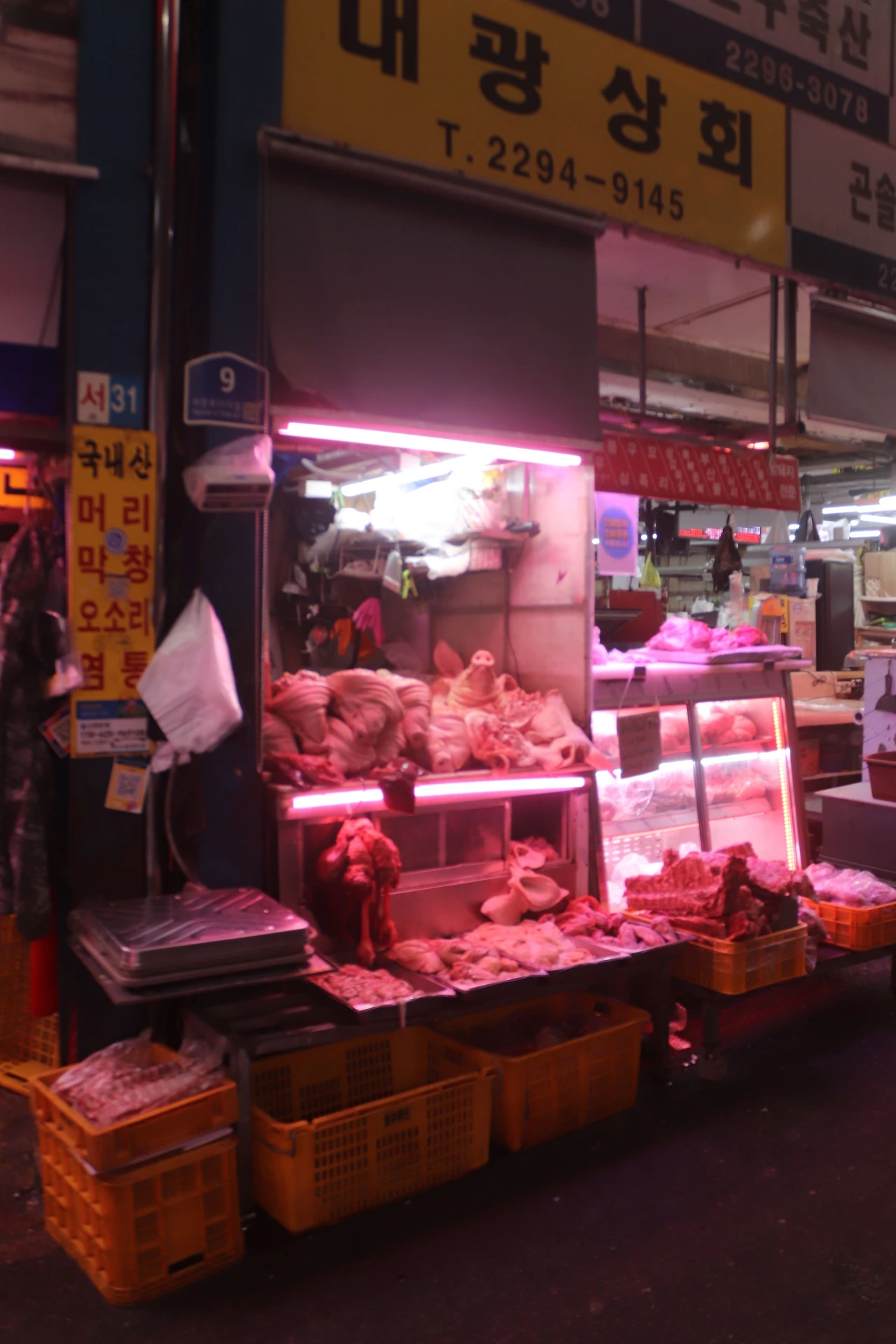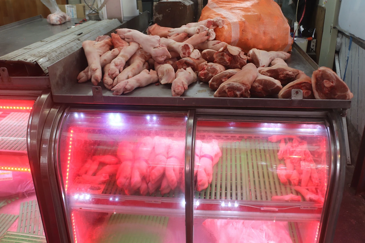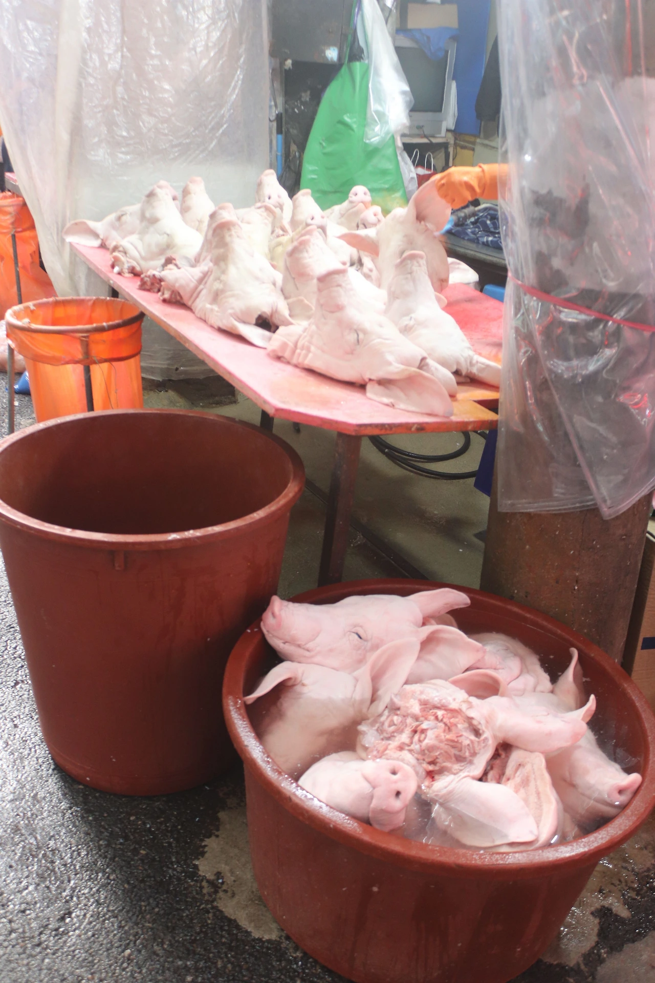 초입에는 고기를 예쁘게 포장해 놓고 파는 가게들이 즐비하지만 안으로 갈수록 귀나 내장 그리고 통돼지머리 그리고 소머리까지 고기를 해체하고 나누어 파는 진짜 시장이 나타난다.