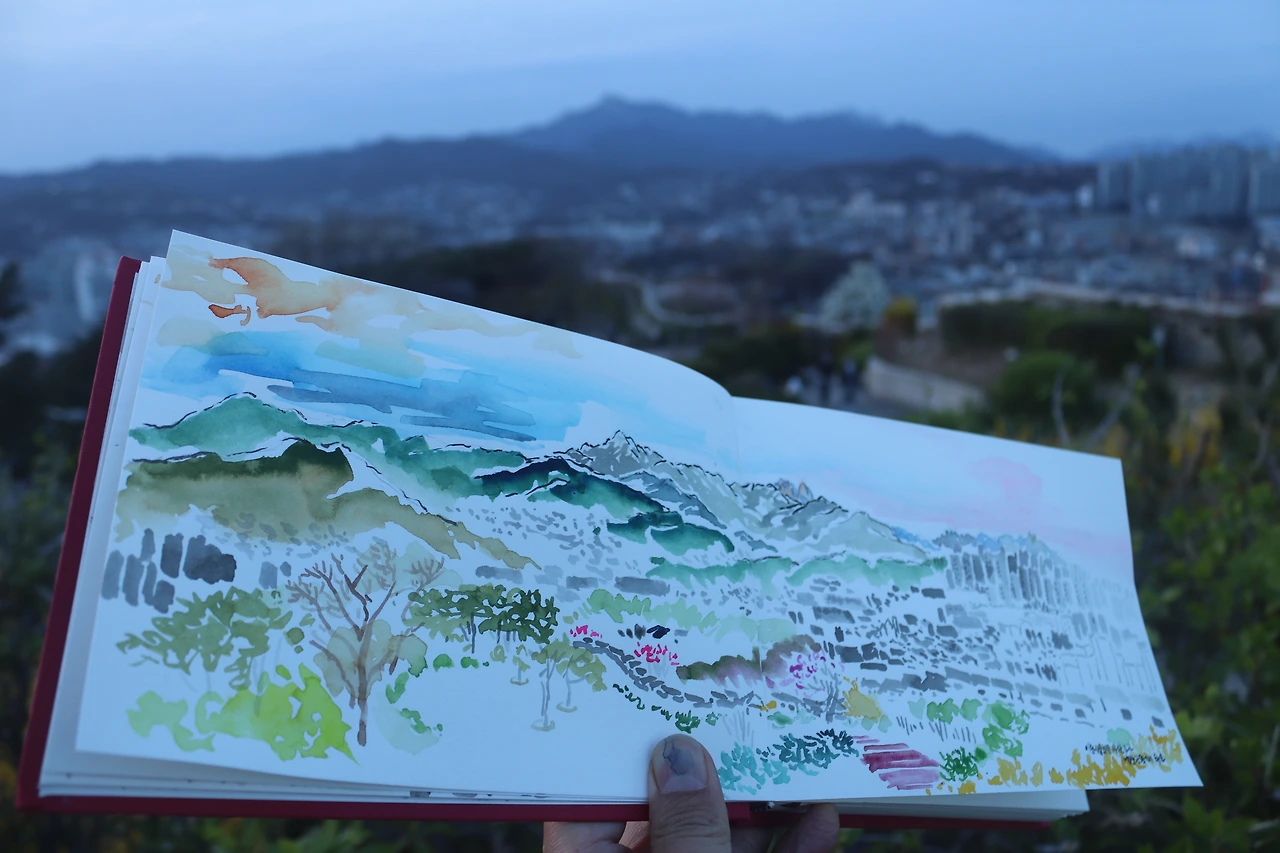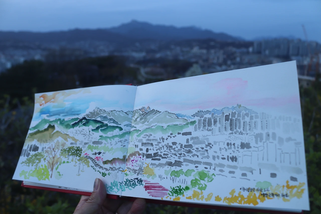 멀리 북한산이 보이고 성곽이 늘어서는 장면에선 '케데헌'에 나왔던 장면의 배경이 명소가 되었다 성벽 따라 걷다 정상부에서 북한산을 배경으로 하는 아름다운 풍경에 스케치북을 꺼낸다