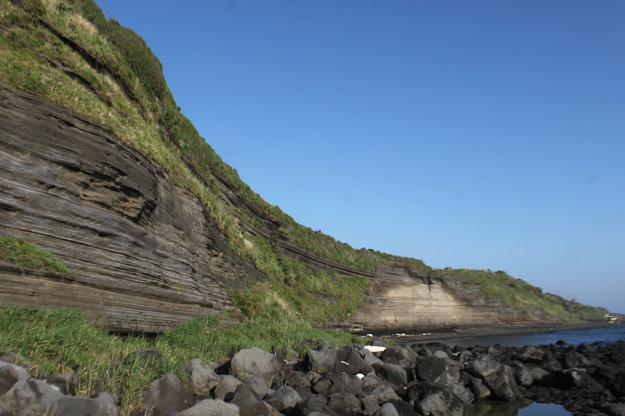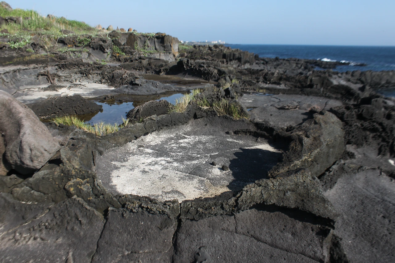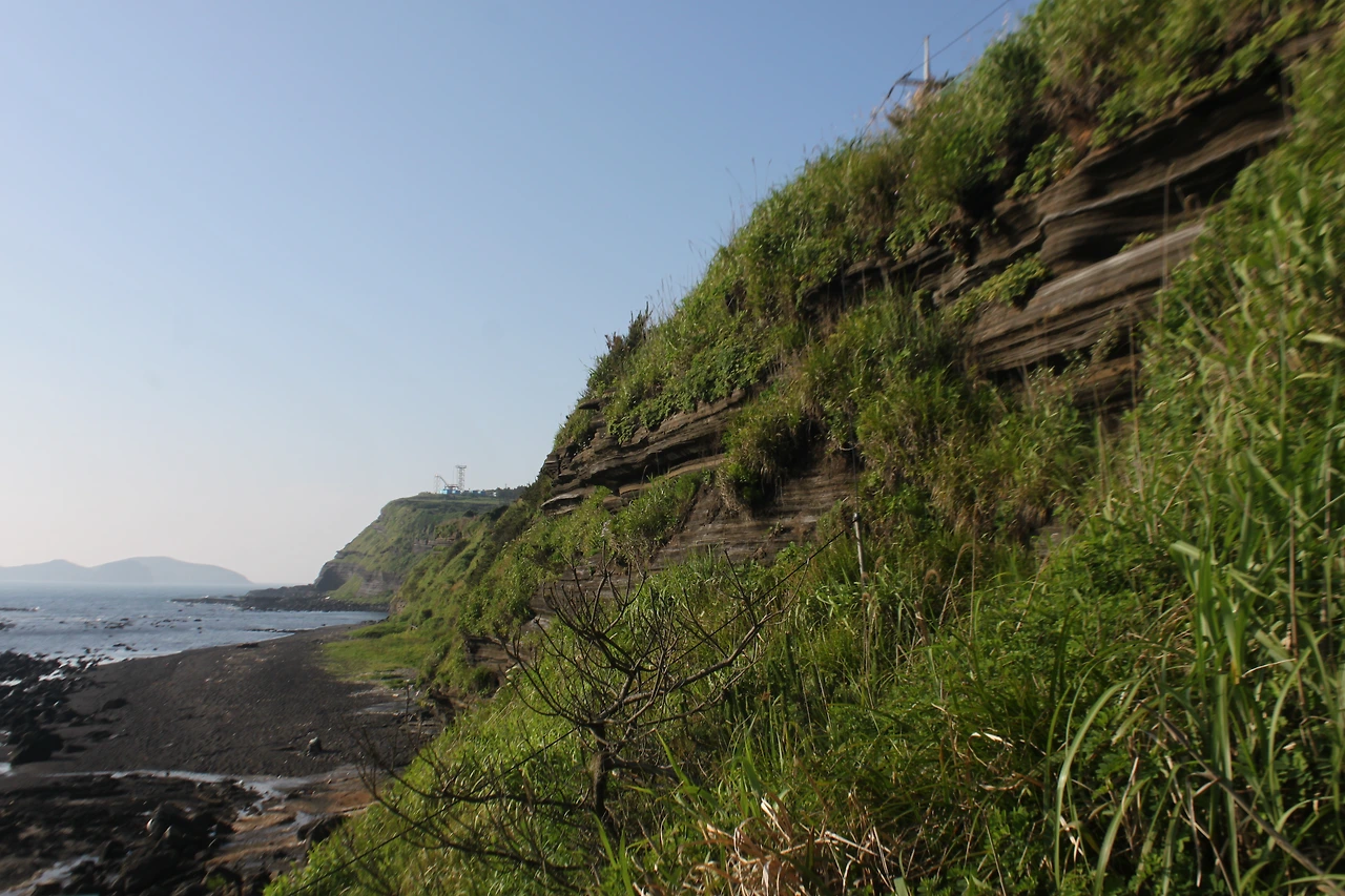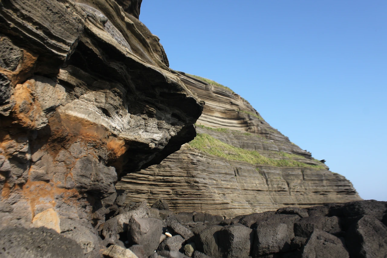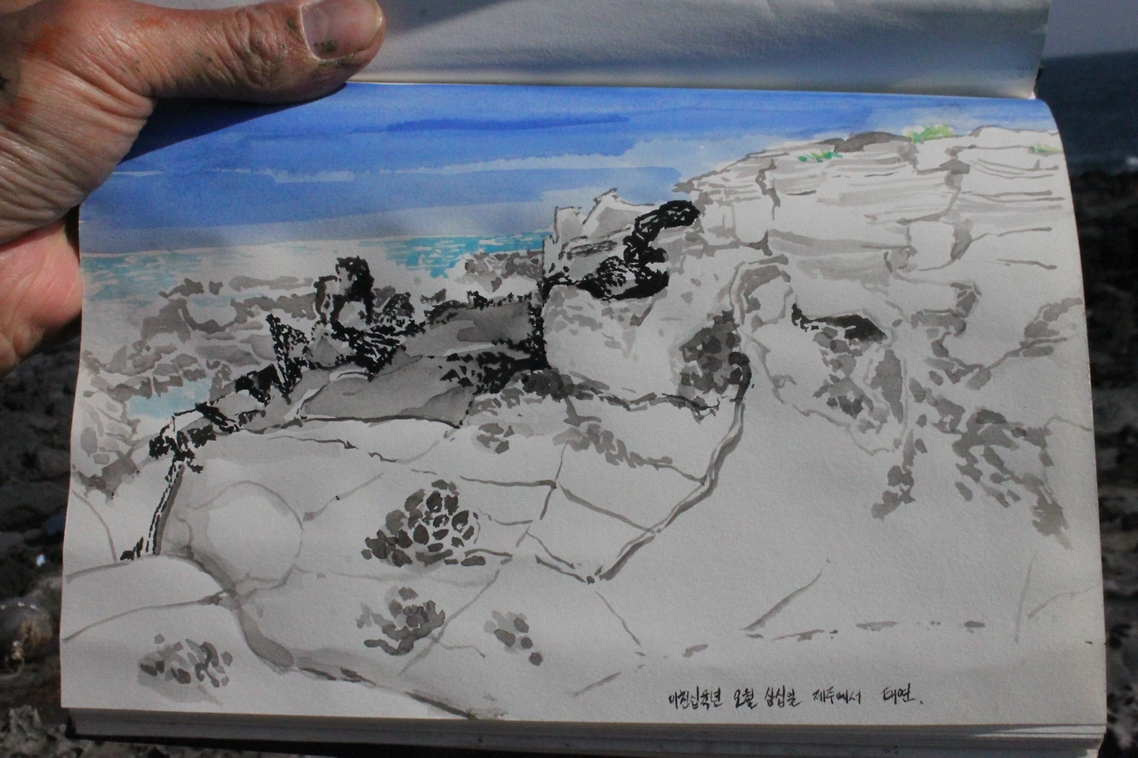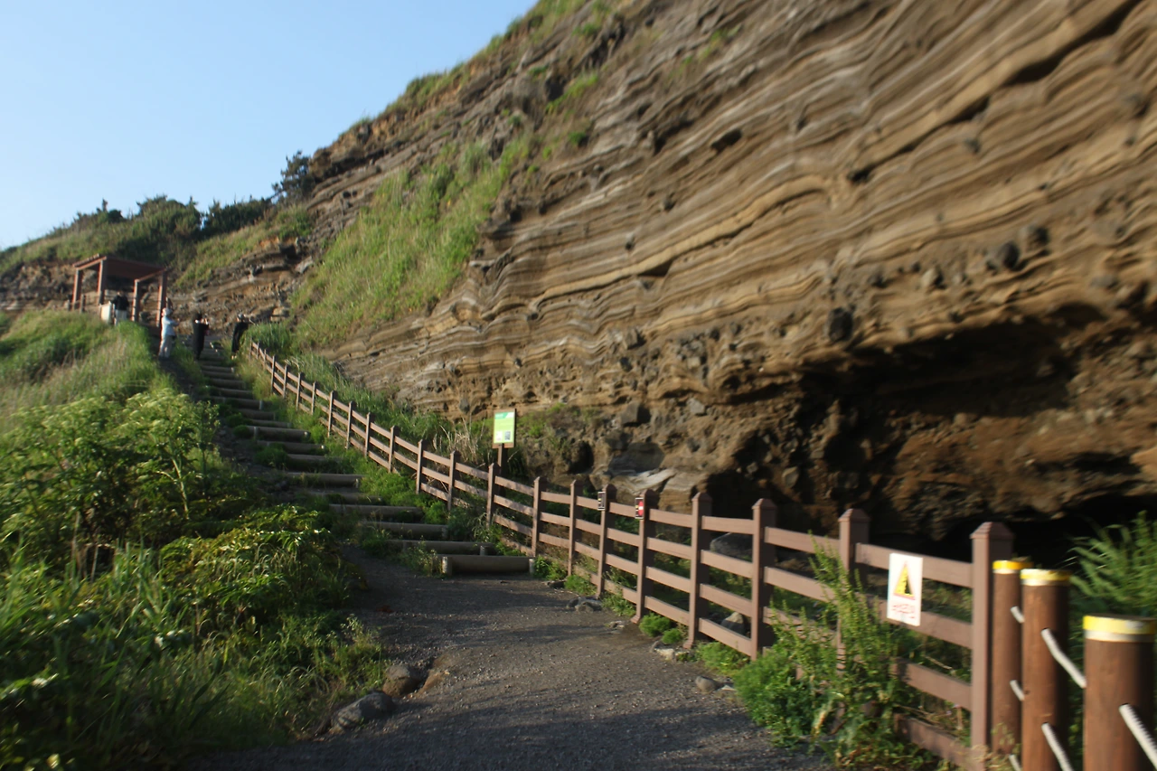 '신도 포구'를 지나 '수월봉'에 다 와가는데 아래로 내려가 보니 화산이 생길 때의 아름다운 층들이 바다와 어우러져 아름답다. 멀리서 아이들과 지질탐사를 하는 분이 오셔서 여쭤보니 '수월봉' 아래쪽으로 한 시간 정도 바위를 타고 가면 반대쪽 입구가 나온다고 해서 가보기로 한다.