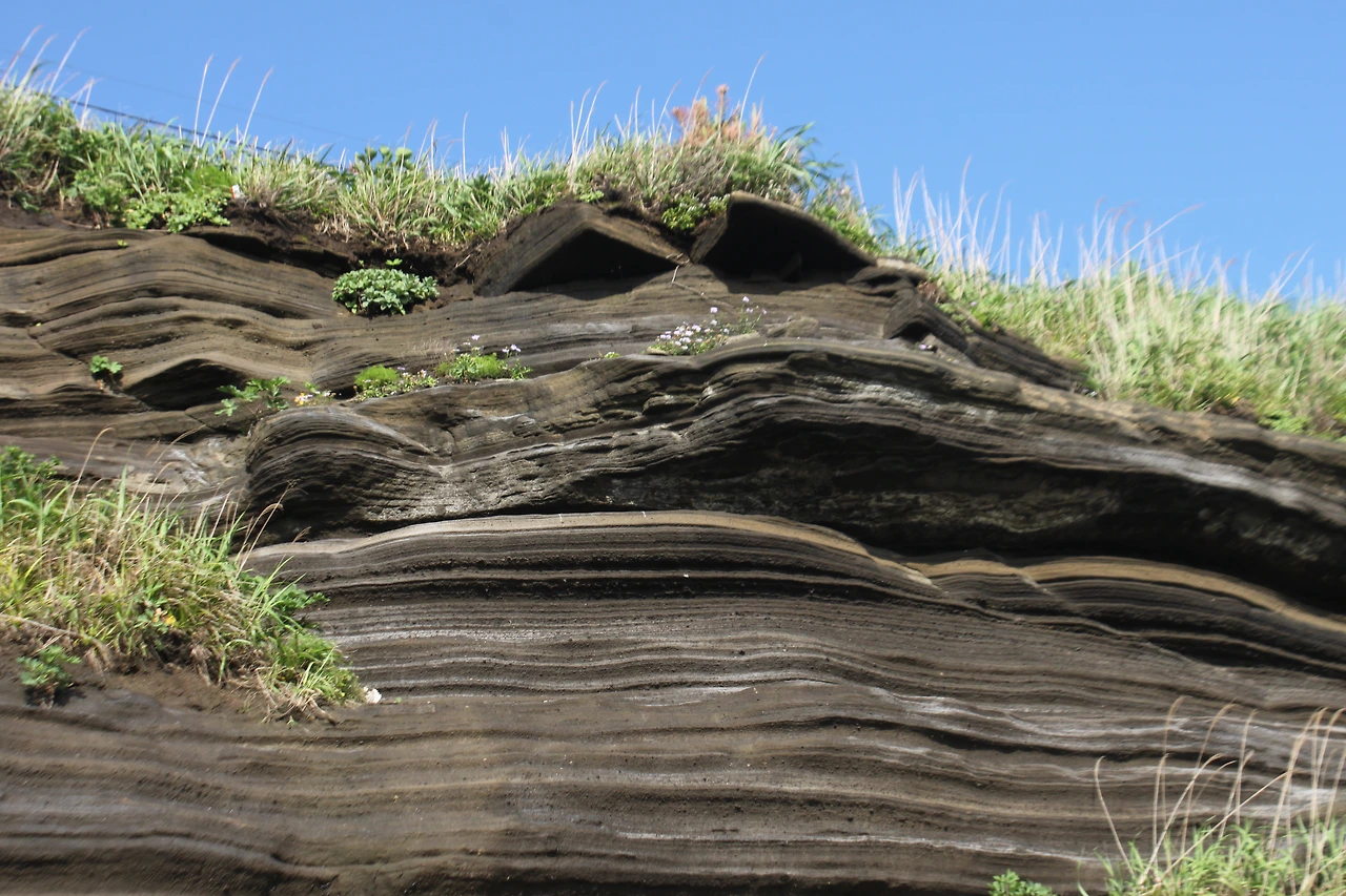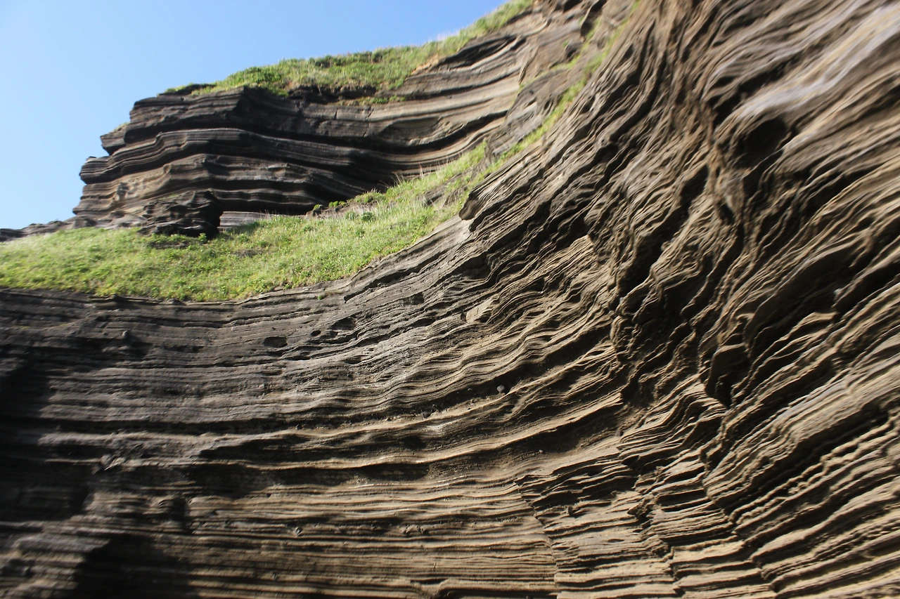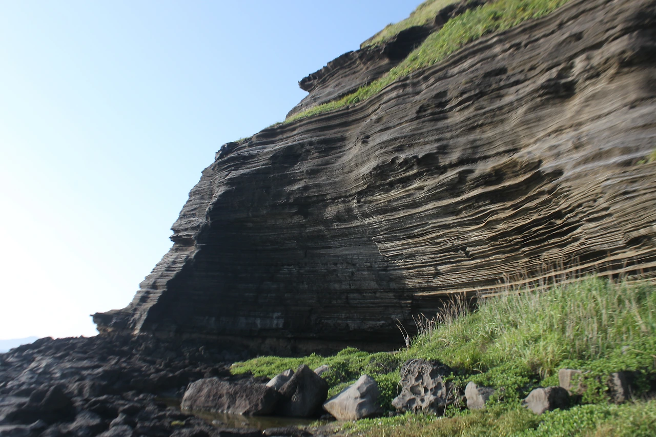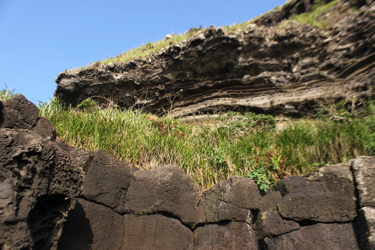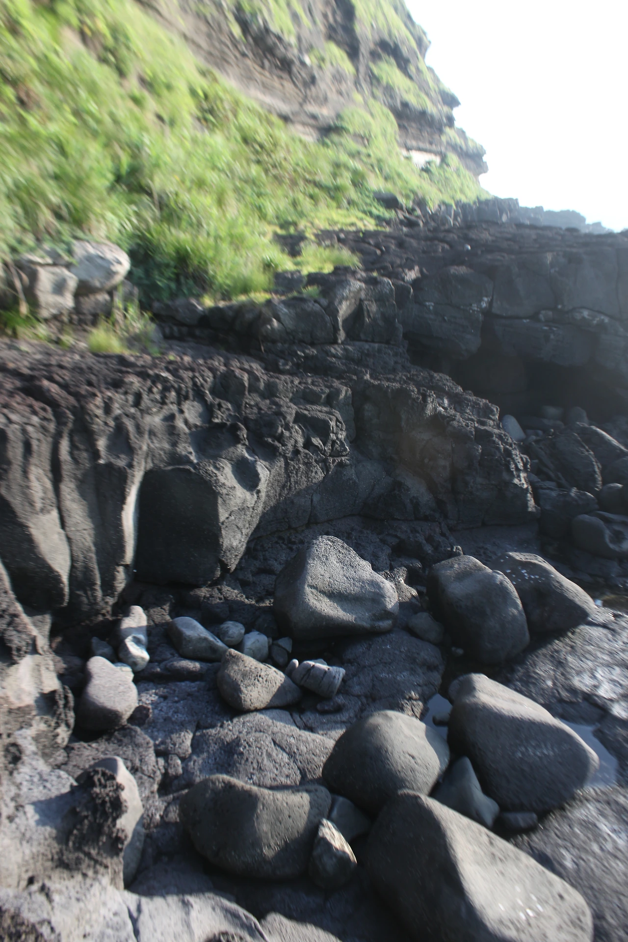 '신도 포구'를 지나 '수월봉'에 다 와가는데 아래로 내려가 보니 화산이 생길 때의 아름다운 층들이 바다와 어우러져 아름답다. 멀리서 아이들과 지질탐사를 하는 분이 오셔서 여쭤보니 '수월봉' 아래쪽으로 한 시간 정도 바위를 타고 가면 반대쪽 입구가 나온다고 해서 가보기로 한다.