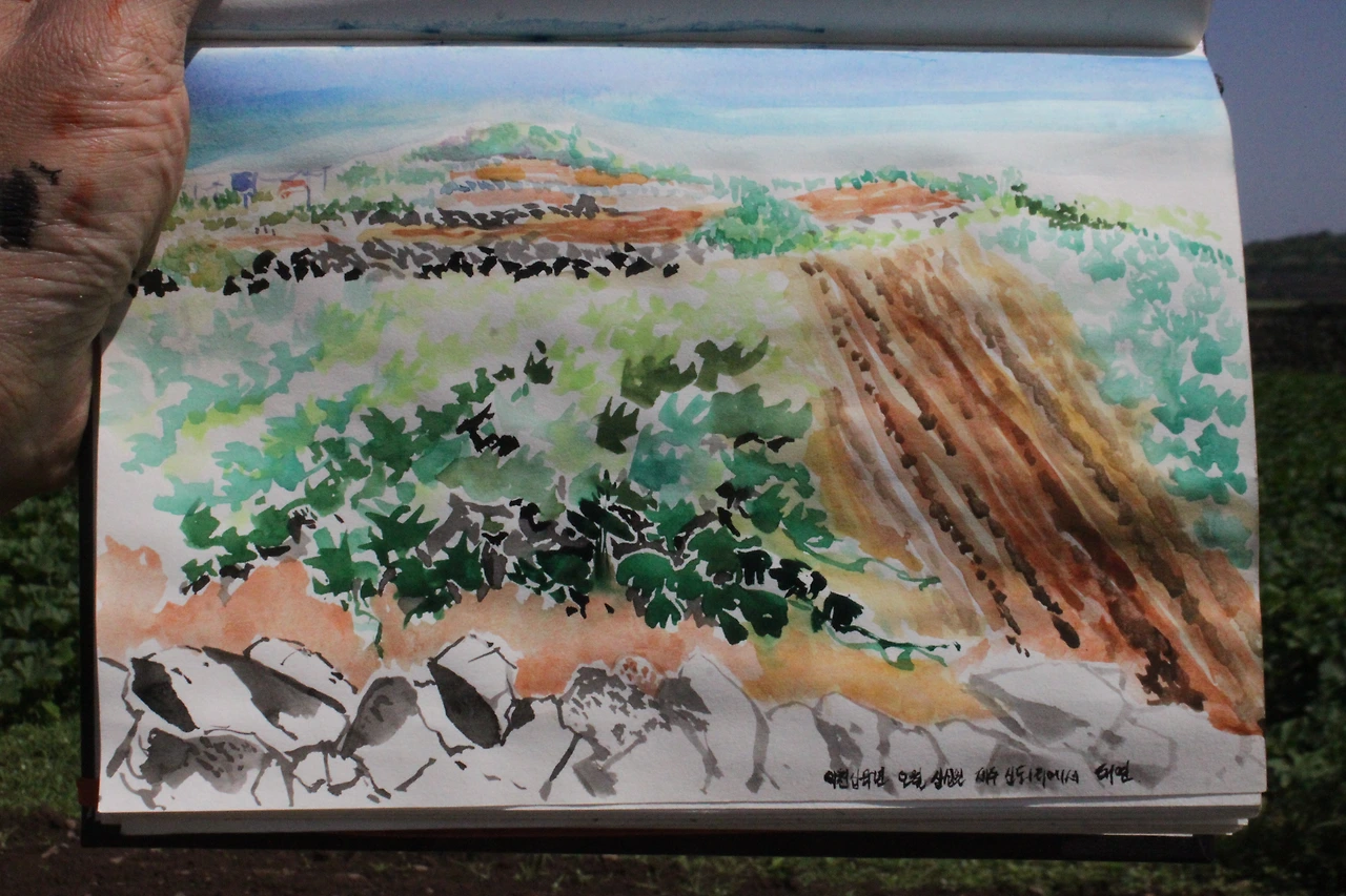마을을 지나 내려오다 앞에 보이는 산과 밭이 정겨워 짐을 풀고 어제 젖은 물감도 말릴 겸 스케치를 한다. 뒤에서 마늘을 말리던 할아버지가 궁금해하셔 이야기하니 손자가 서울에 사신다며 이야기를 풀어놓으신다.