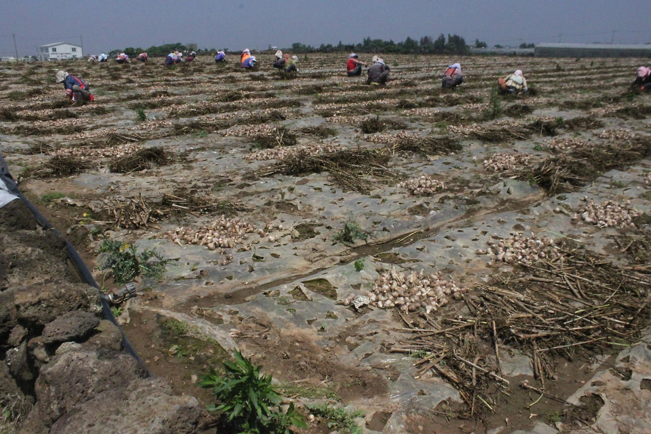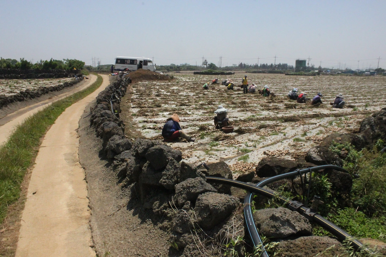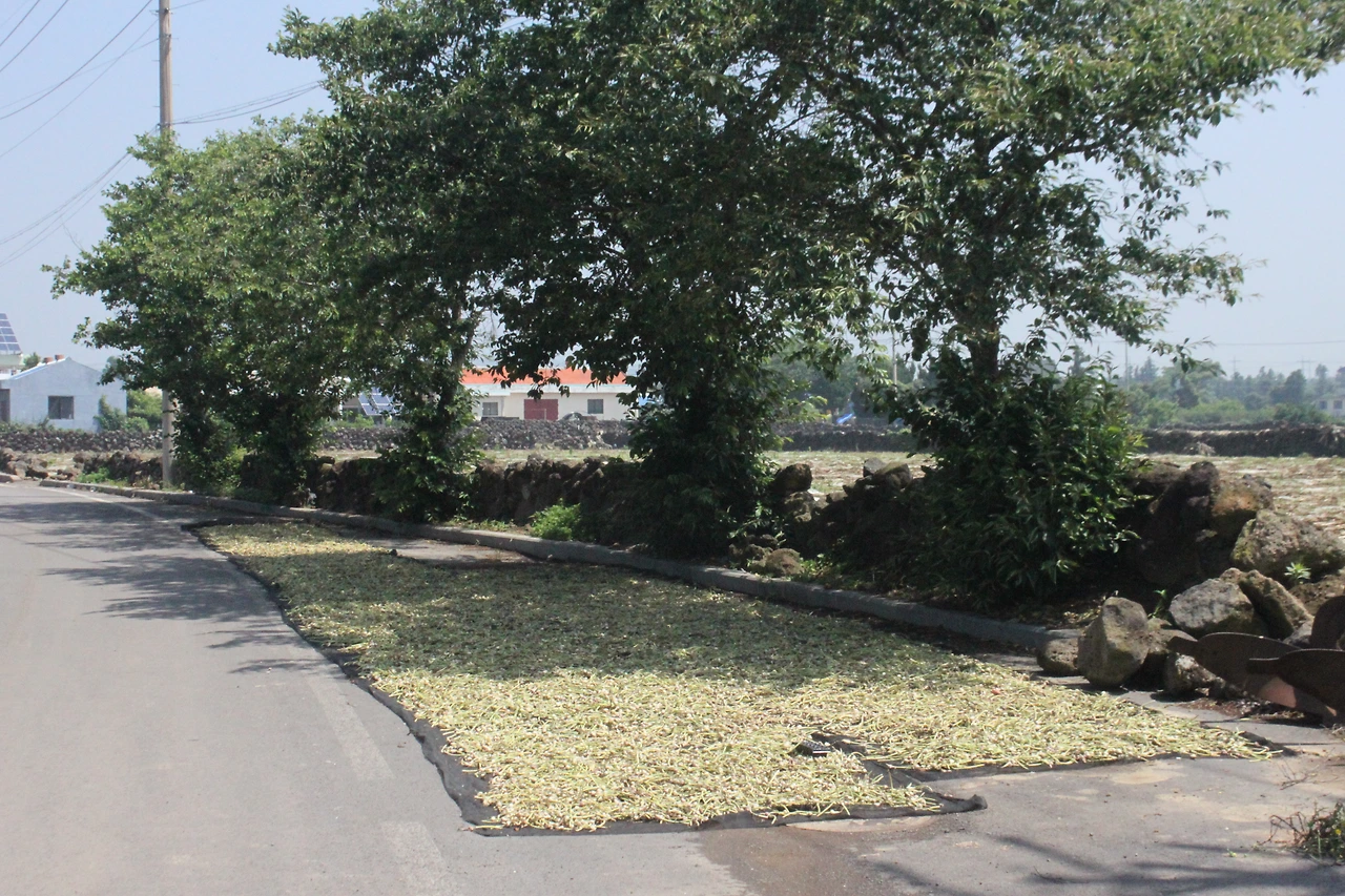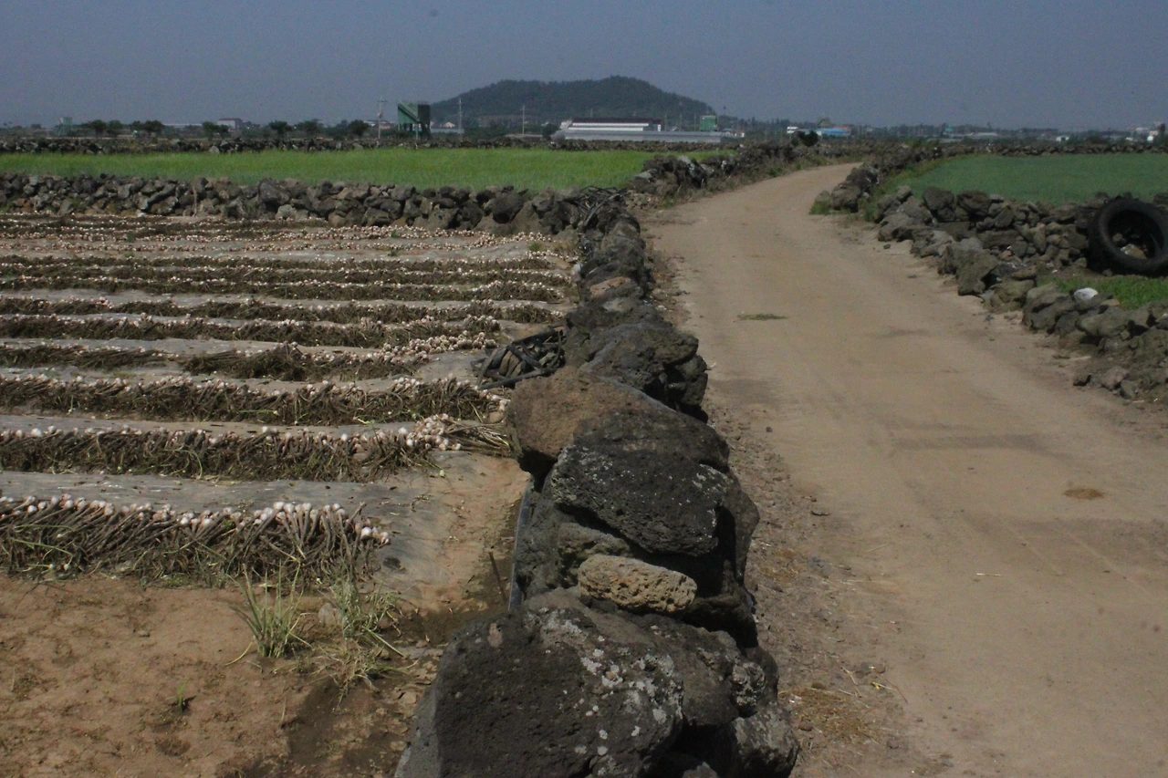 제주자연생태문화체험골(무릉생태학교)가 있는 마을 입구에서 걷기 시작해 마늘밭이 있는 밭고랑 사이를 걷는다. 마늘수확철이 되었는지 사람들이 수십 명씩 열심히 마늘을 거둬들인다.