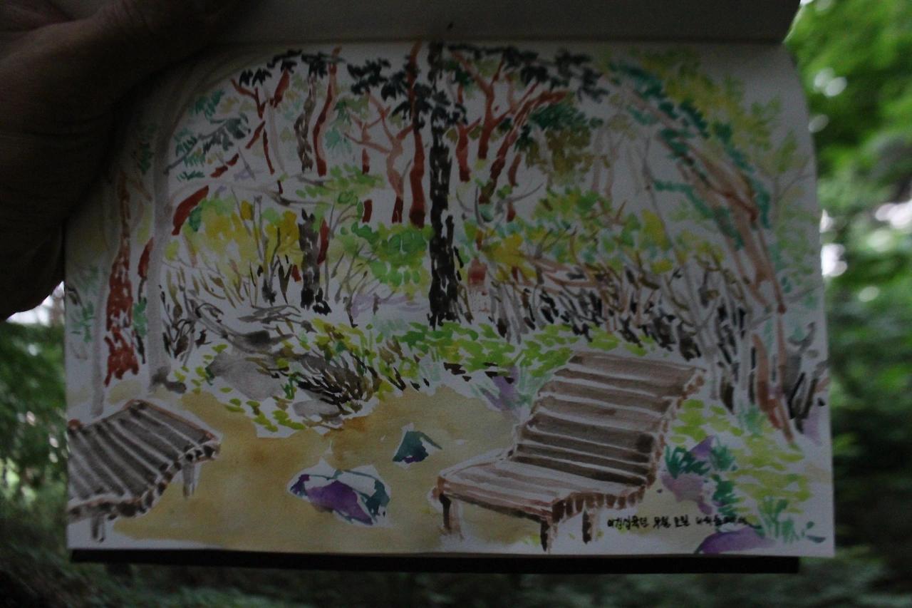 산과 길에 대한 차이가 있다면 길은 가다가도 내가 머물고 싶은 순간에 더 머무를 수가 있고, 그만 정리할 수도 있지만 산은 오르면 반드시 내려와야 한다. 잠깐 눈을 붙이고 숲을 바라보다 스케치북을 펼친다. 그렇게 나만의 시간을 보내고, '나의 숲'을 어둠 속에 남겨둔다.