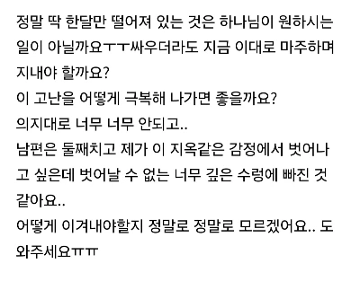 지금 얼마나 힘들지~ 이런 말 하긴 죄송하지만, 그럴수록 더 기도로 하나님께 매달려야 하지 않을까요?~ㅠ 한 달간 떨어져 지내면 함께 지내는 것이 더 힘들 수도 있어요~