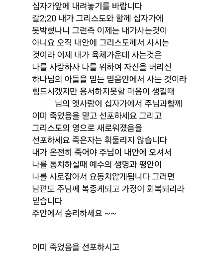 둘째로 ㅇㅇㅇ님의 모든 감정과 생각과 자아를 온전히 십자가 앞에 내려놓기를 바랍니다.