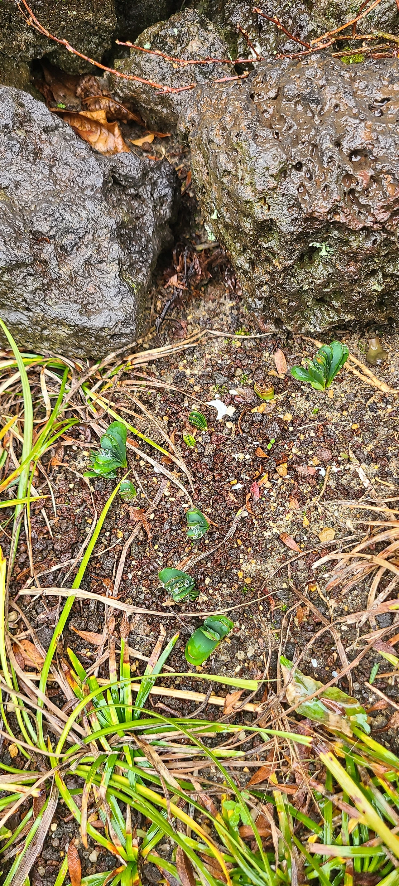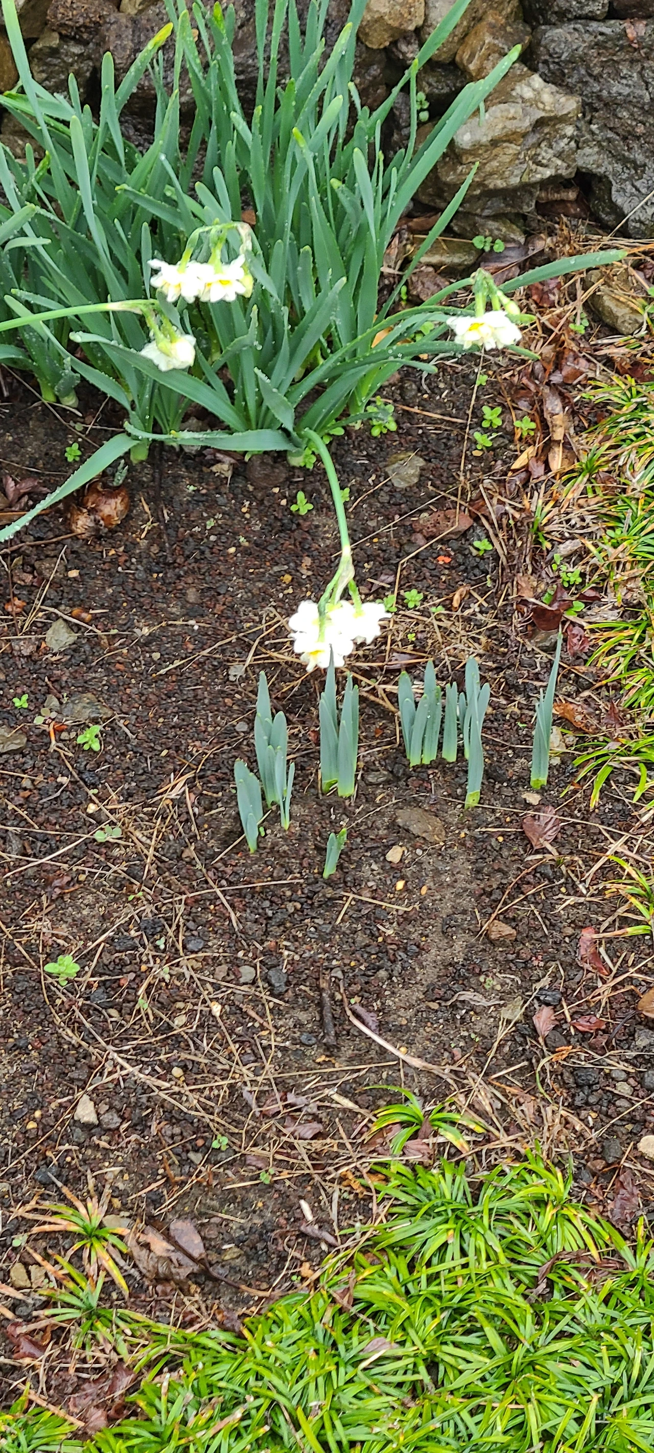 하얀 수선화, 돌 앞에서 싹을 낸 노란 수선화들